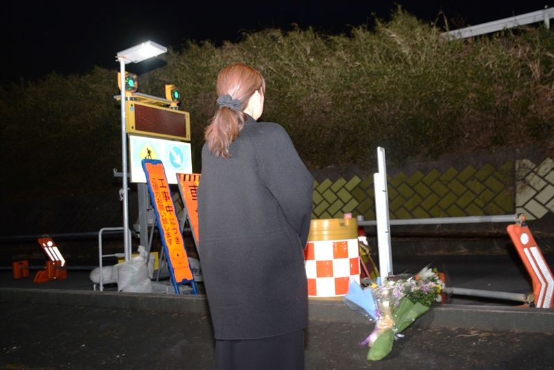 現場近くに花を手向け、事故が起きた新4号国道を見上げる多恵子さん=14日午後9時20分、宇都宮市下栗町