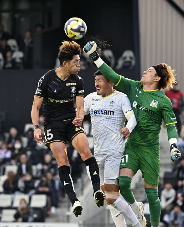 後半44分、栃木シティのDF佐藤(左)が空中戦で競り合う=CFS、森田大地撮影
