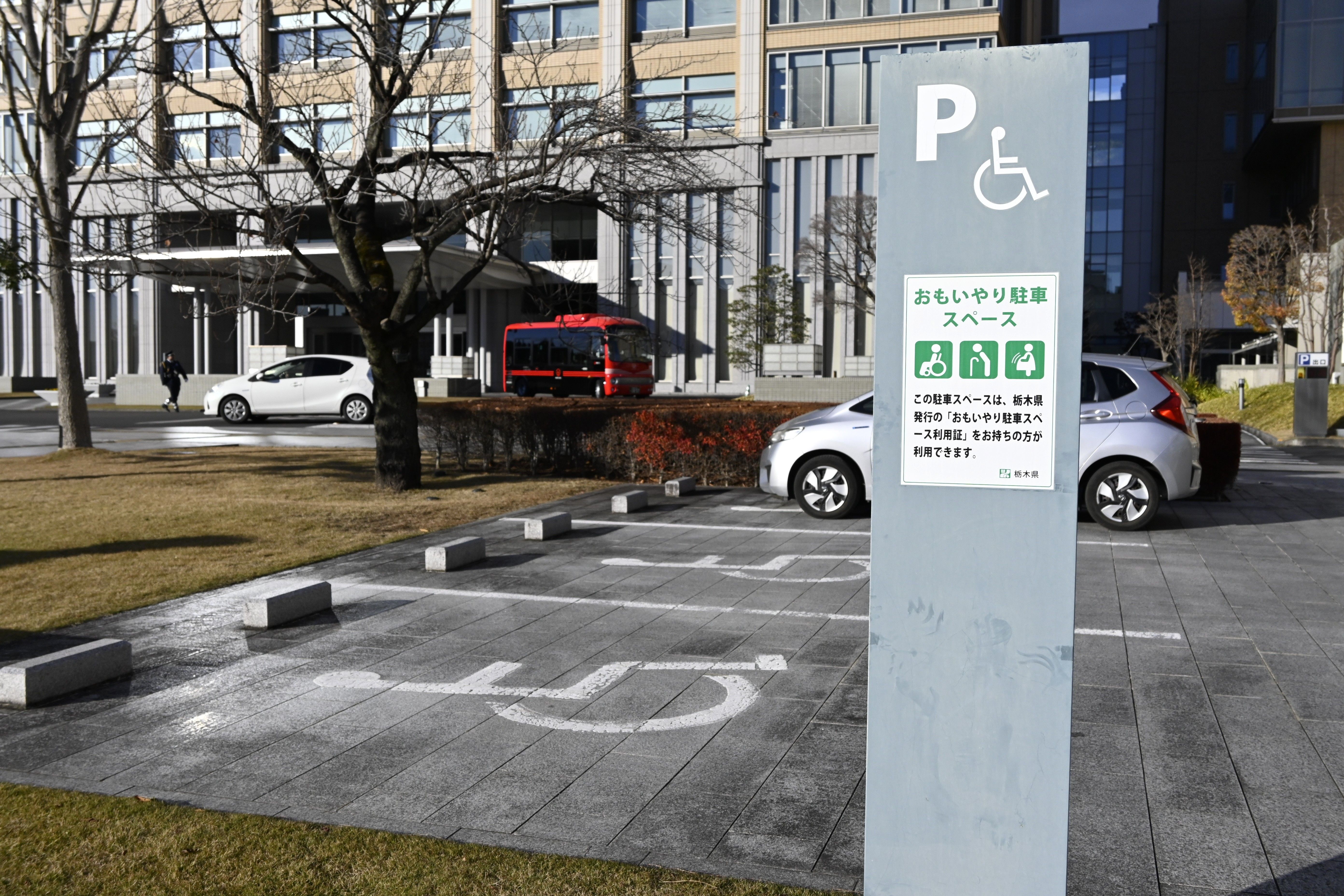 県庁の入り口近くに設けられたおもいやり駐車スペース=12月上旬