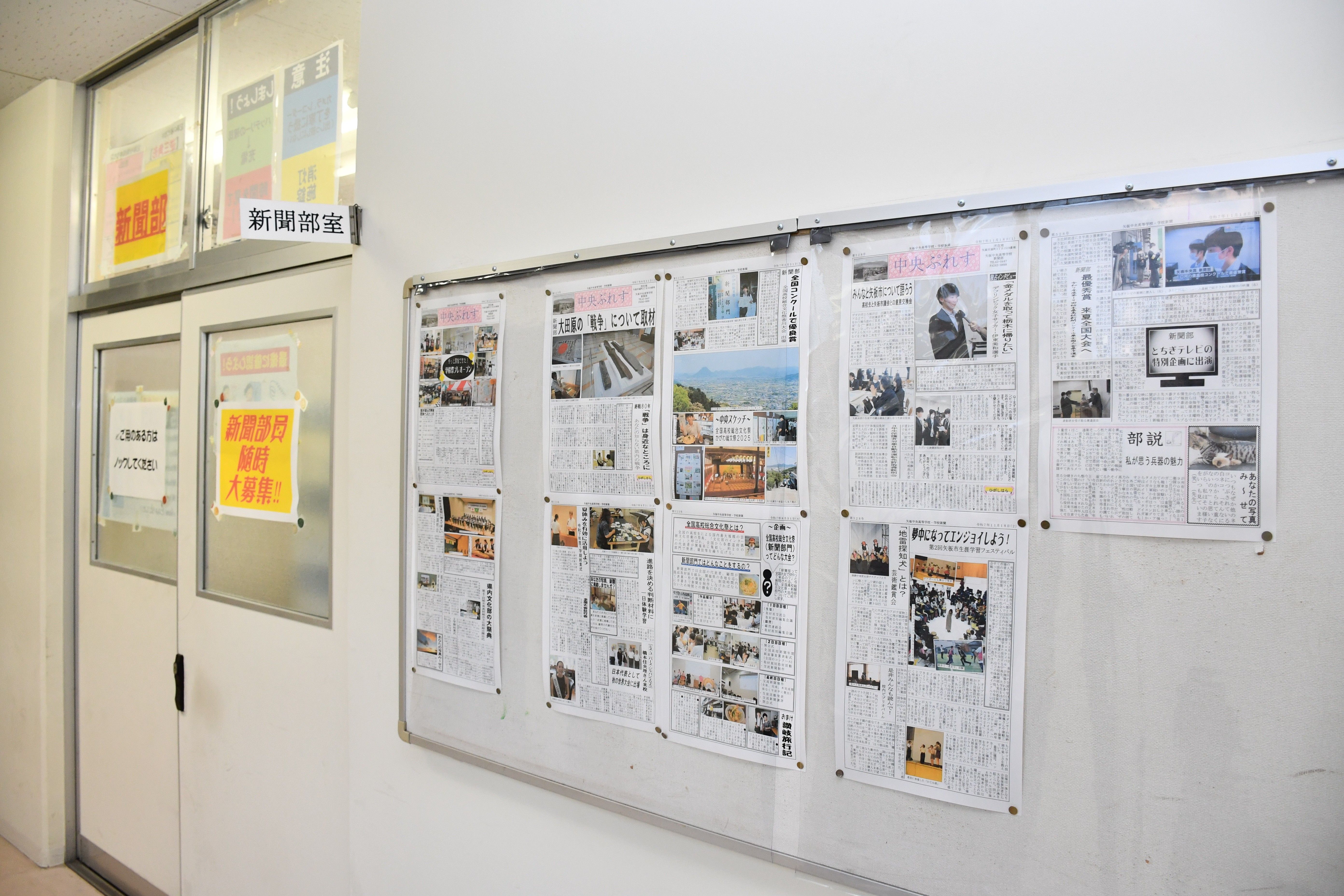 新聞部の部室前に掲示されている「中央ぷれす」=10日午後4時、矢板中央高