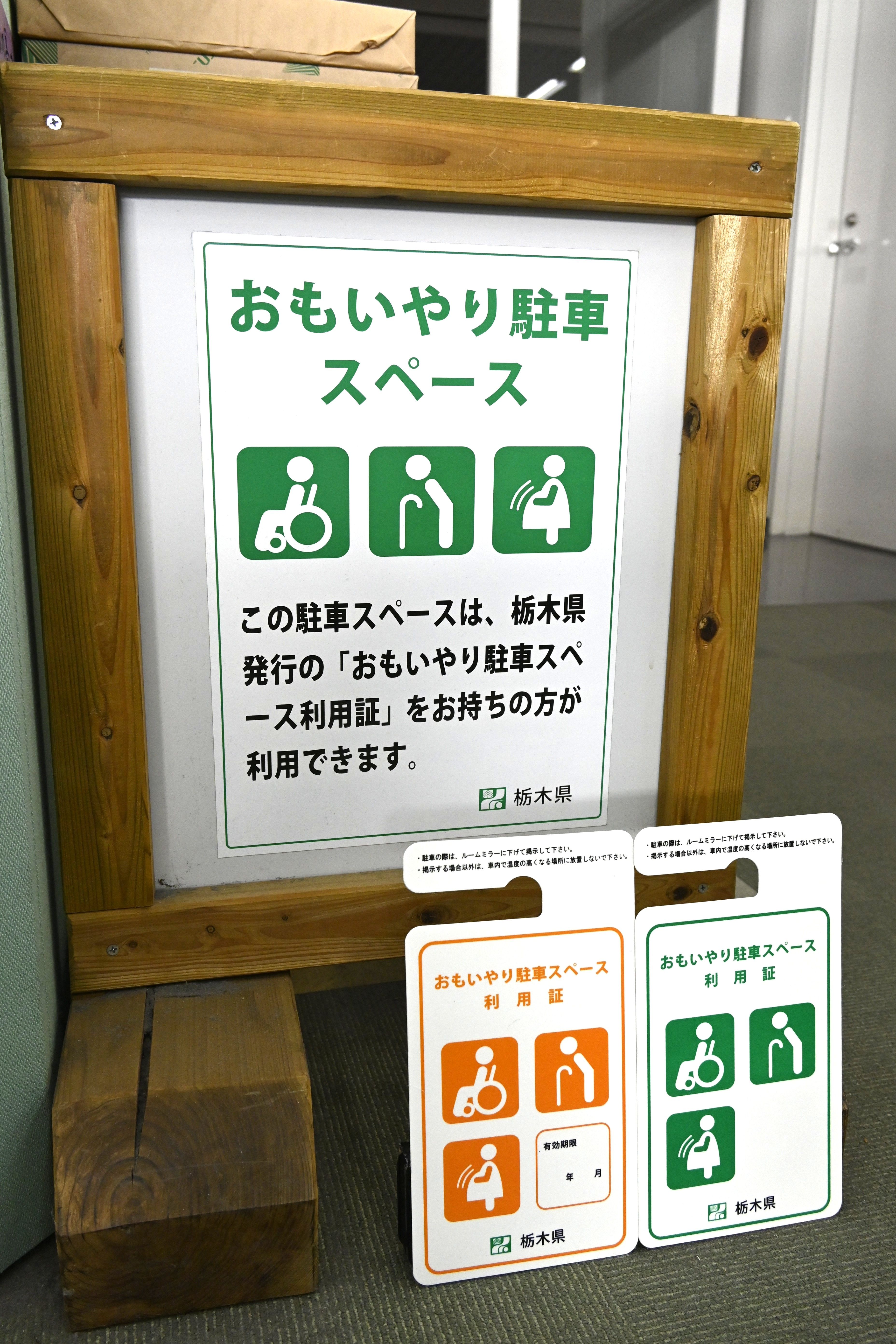 おもいやり駐車スペースを示す看板と利用証=12月上旬、県庁