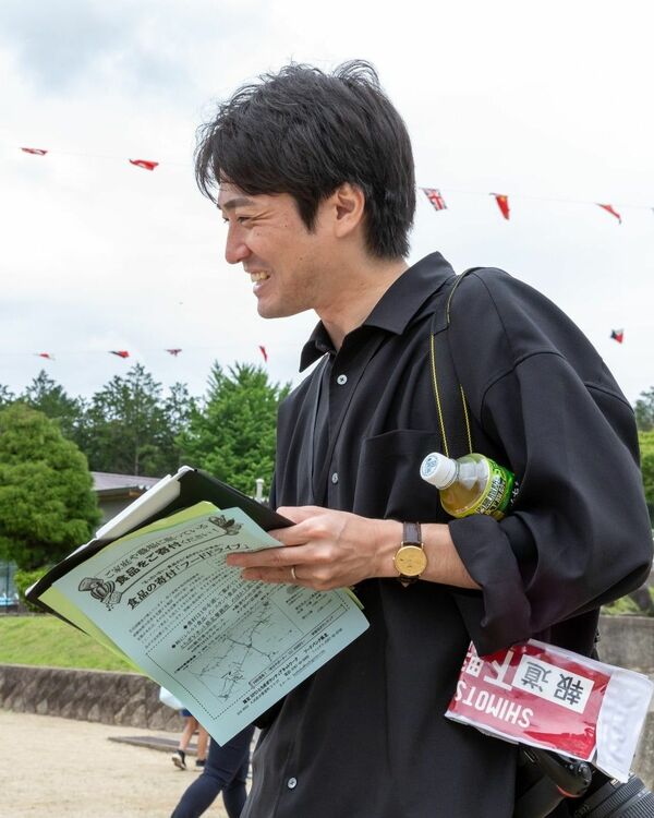 小学校の運動会で取材する草場記者=5月下旬、大田原市内