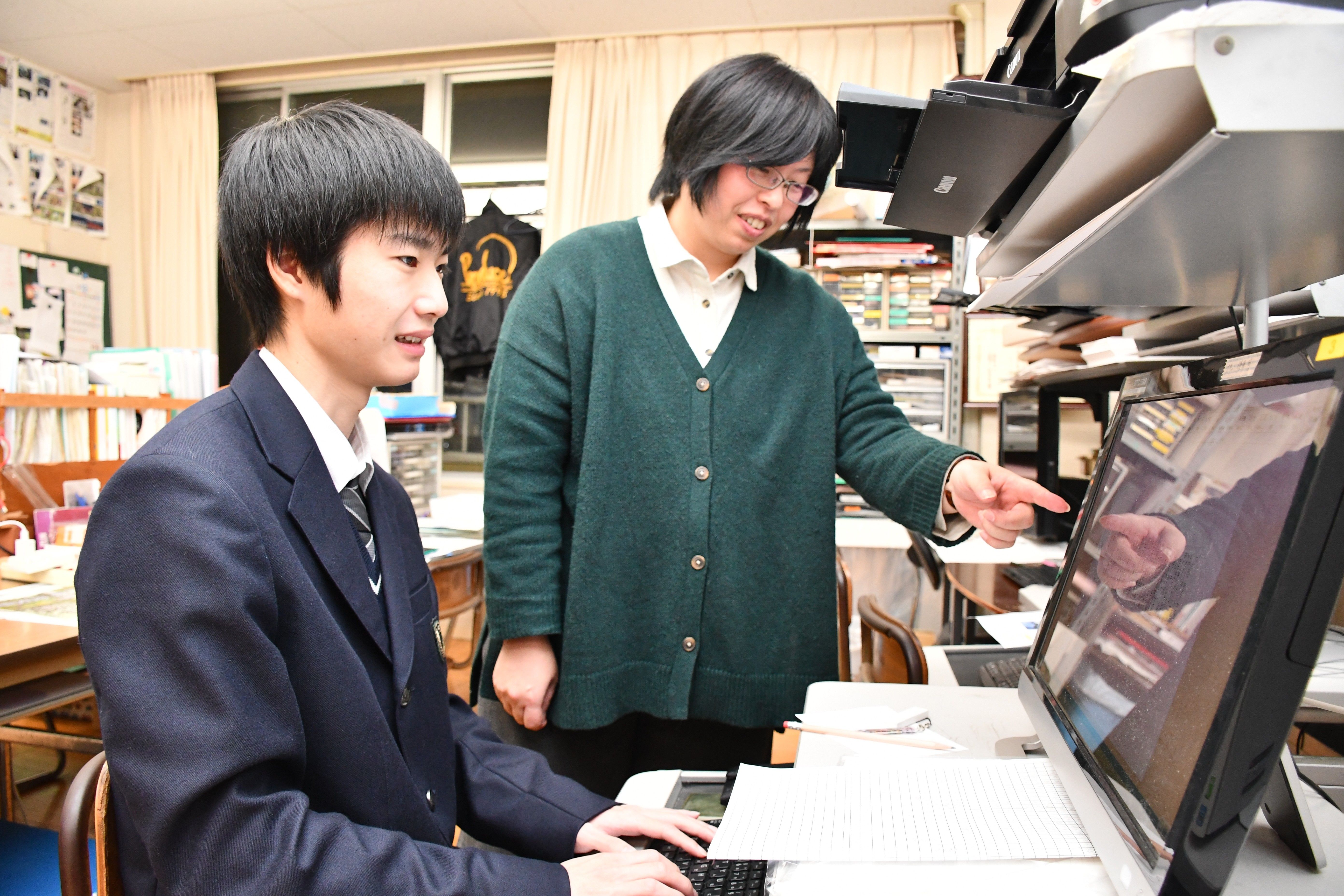 9月に入部した平松さん(左)。内藤教諭の指導の下、新聞製作に励んでいる=10日午後5時、矢板中央高