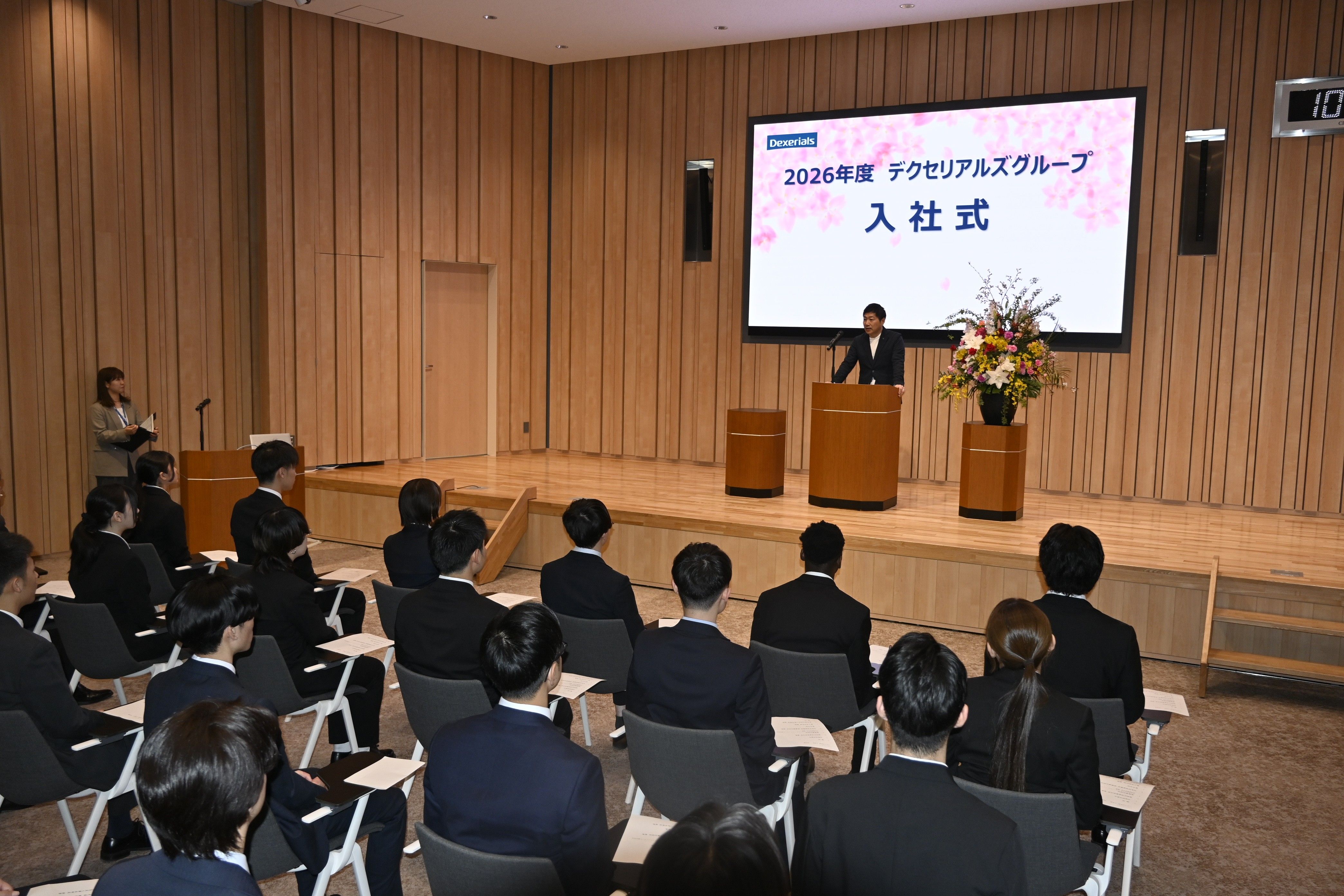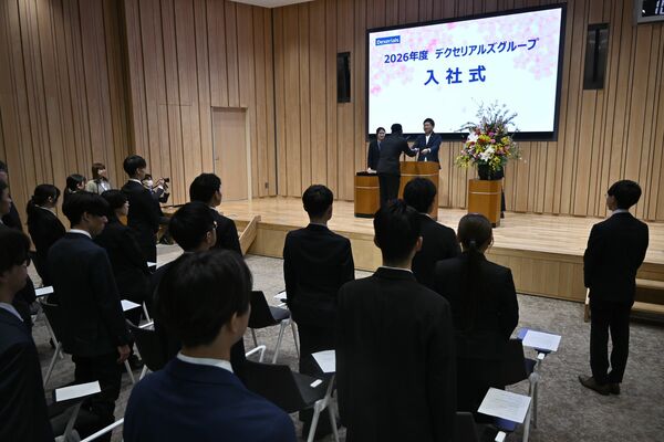 24人の新入社員を激励するデクセリアルズの新家社長=1日午前、下野市