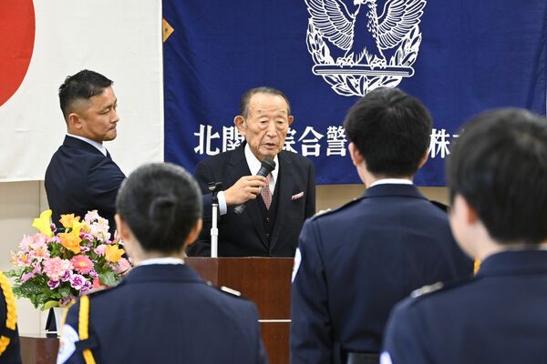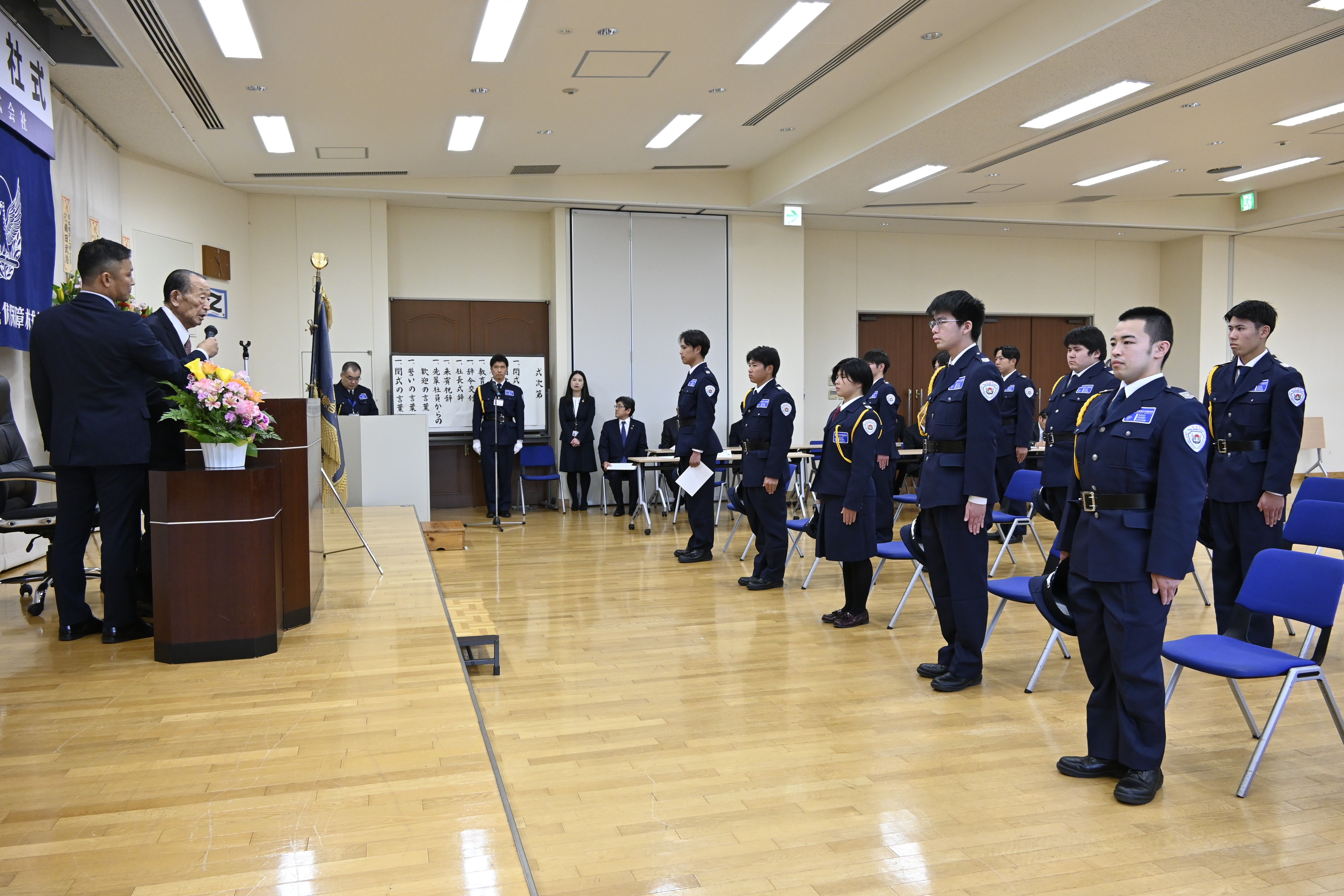 北関東綜合警備保障の入社式で青木会長(左端から2人目)から激励を受けた新入社員たち=1日午前、宇都宮市