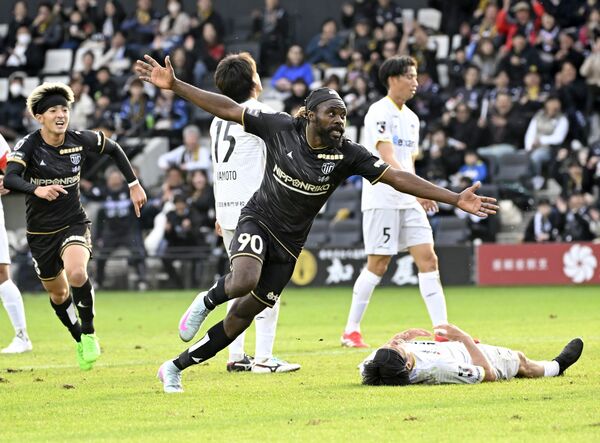 後半30分、栃木シティのFWウタカ(中央)が勝ち越しゴールを決めて駆け出す。左は同点ゴールを決めたMF大嶌=CFS、森田大地撮影