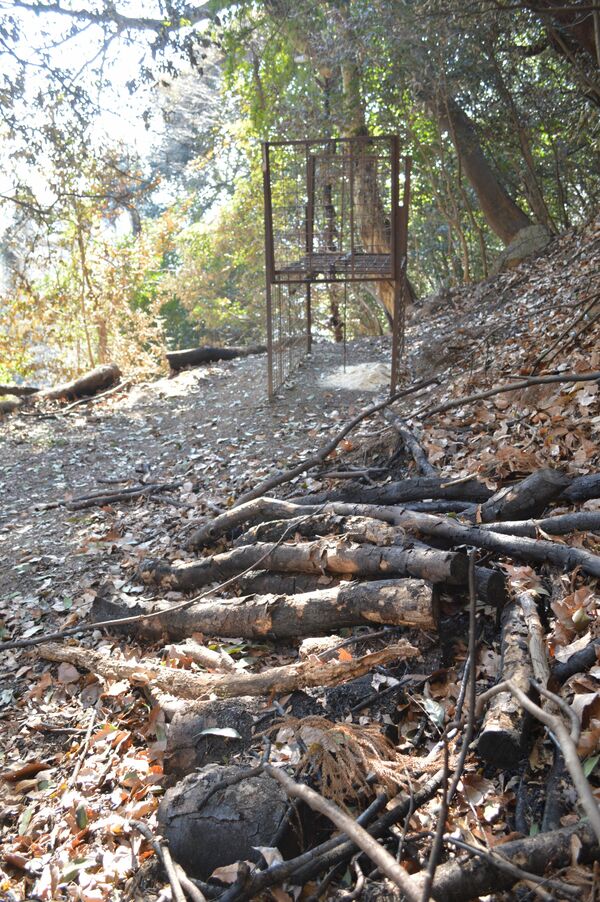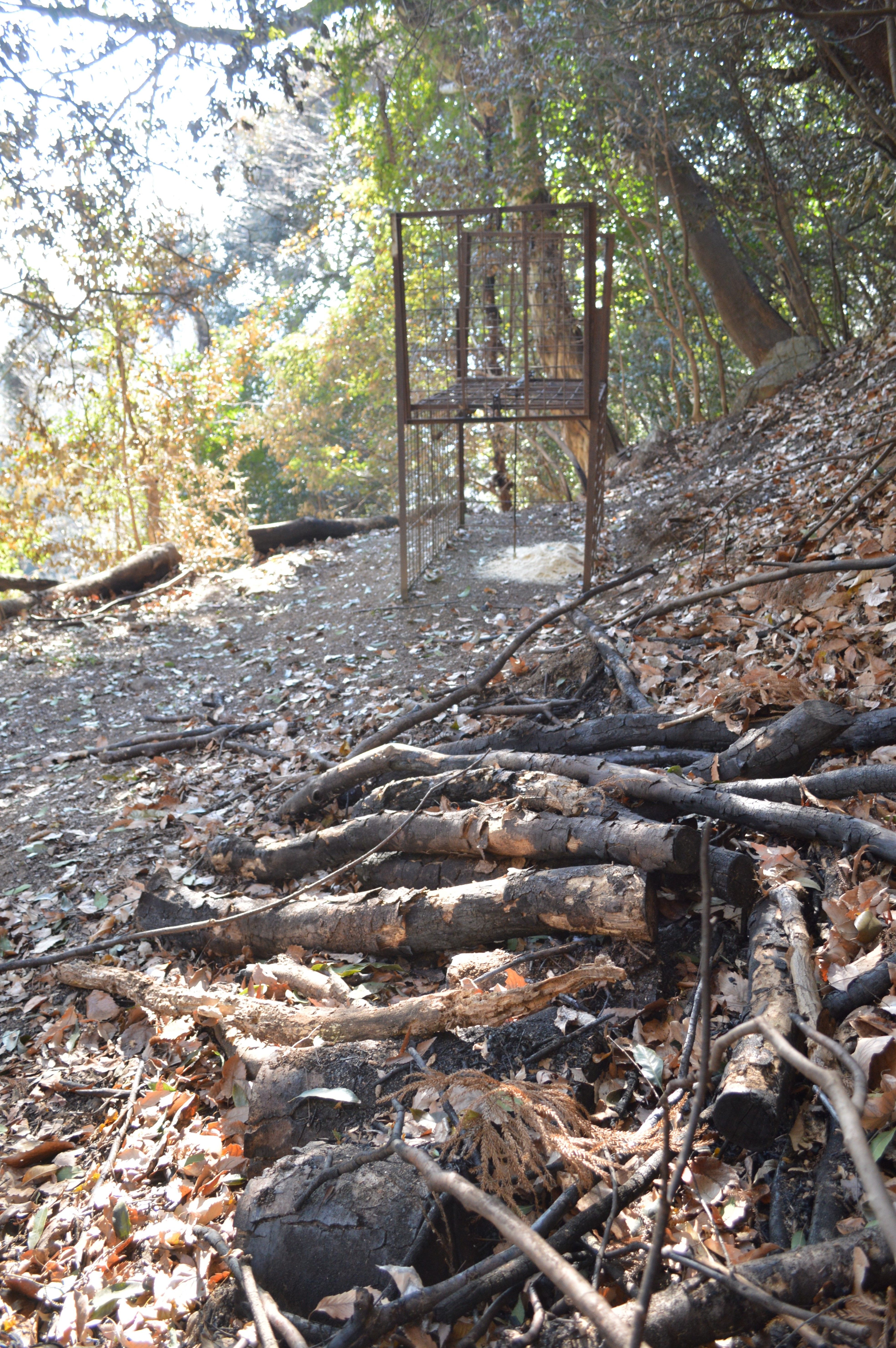 火災で焦げた丸太などが残る大岩山毘沙門天近くの火災現場=10日午前、足利市大岩町
