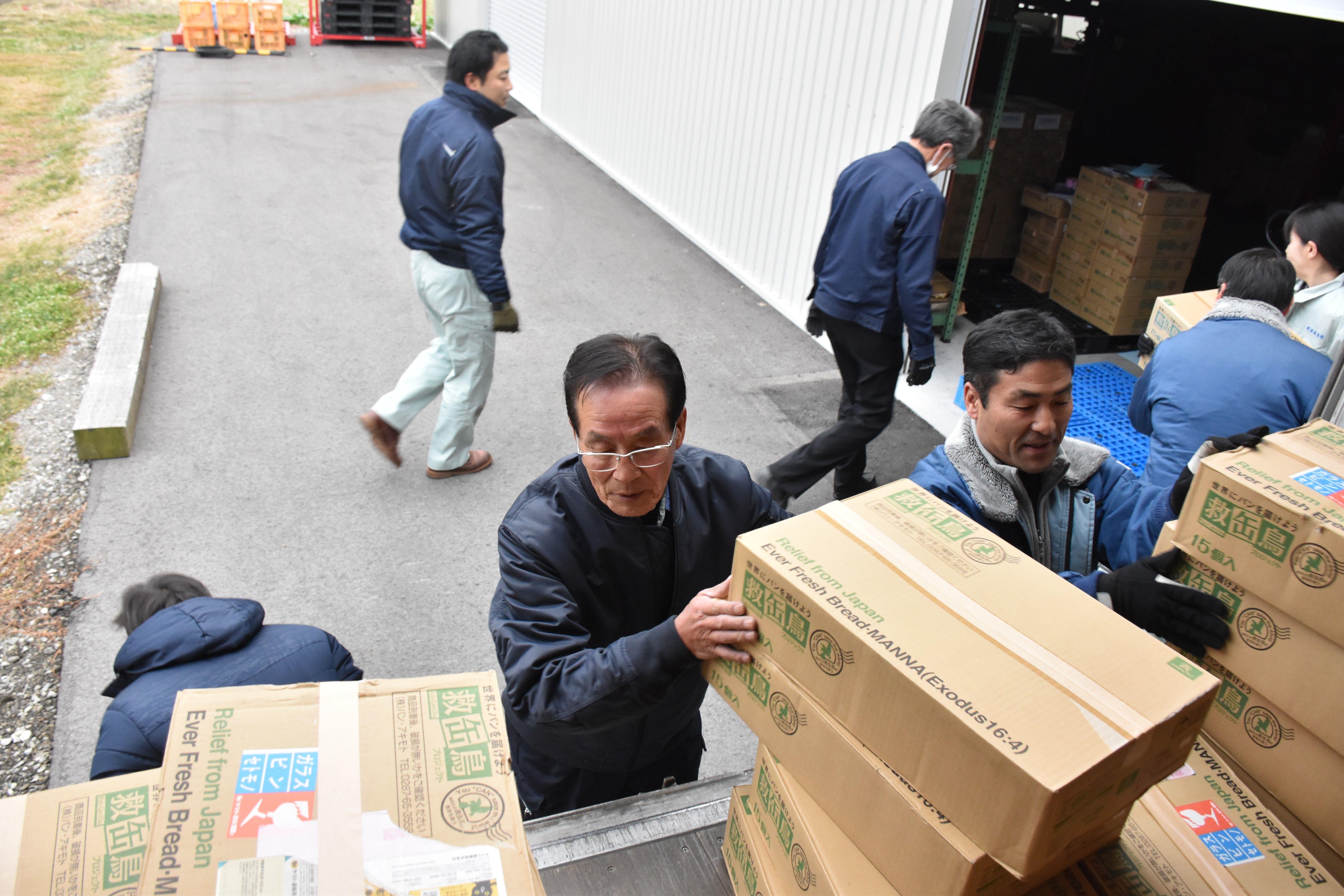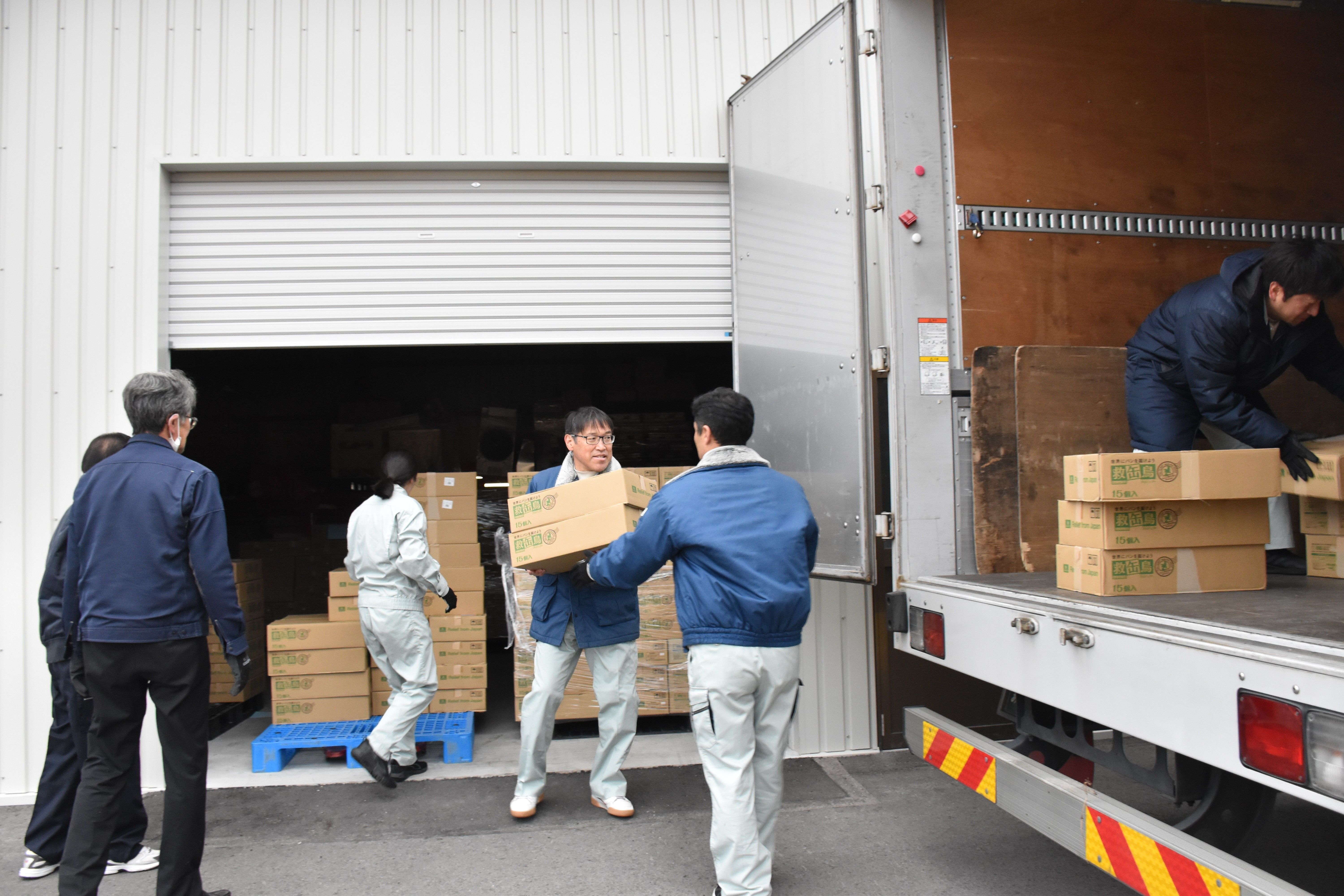 支援物資の積み込み作業を行う那須塩原市職員ら=2日午後、那須塩原市東小屋