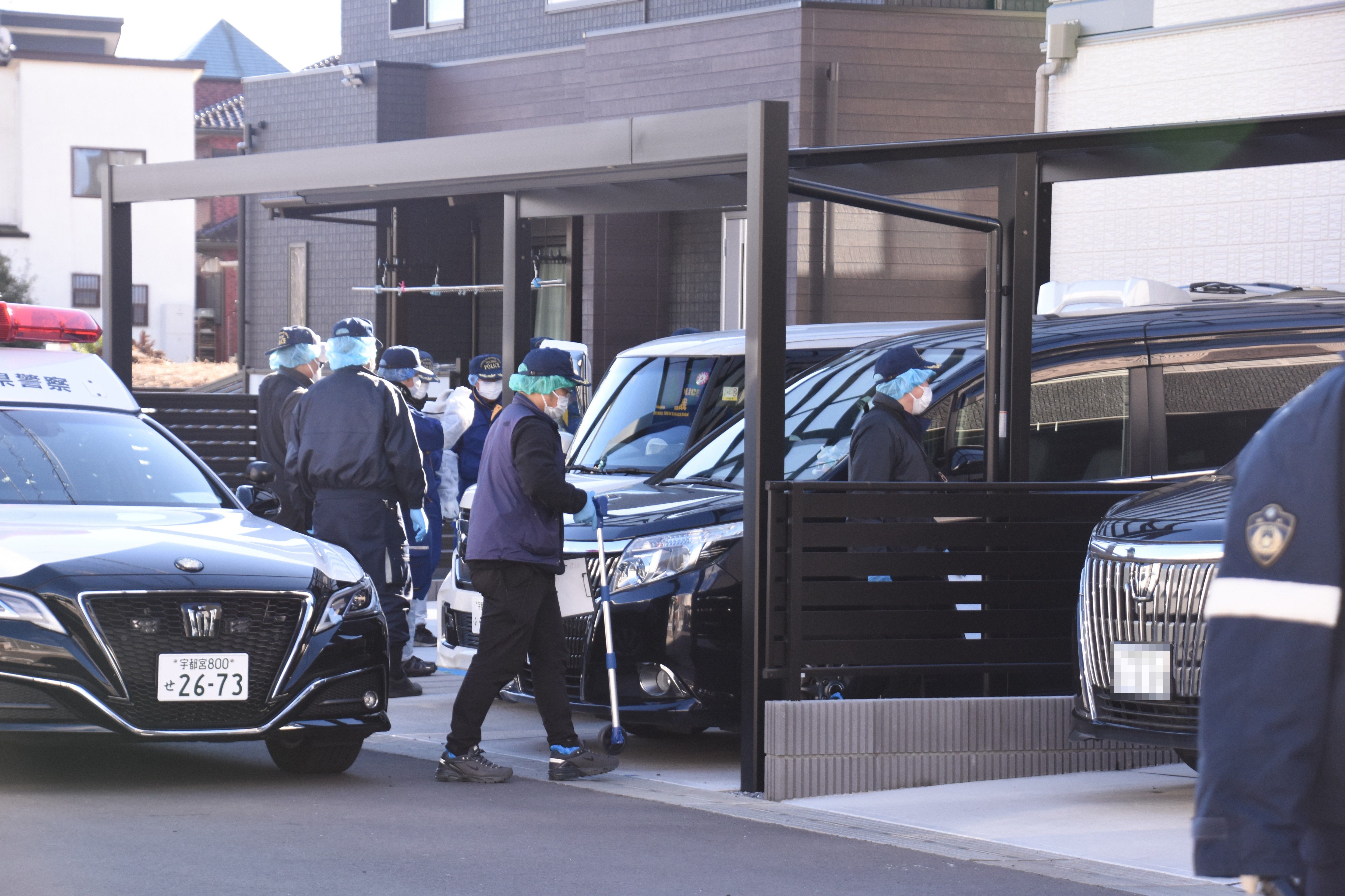 男児2人の遺体が見つかった住宅や車を調べる捜査員=8日午後、宇都宮市上戸祭町