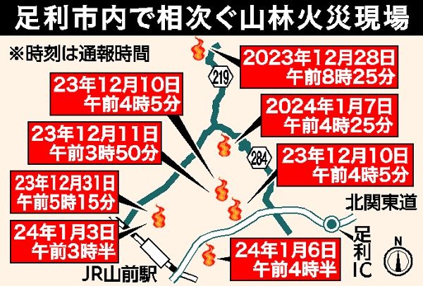足利で山火事8件、放火か 昨年12月から半径4キロ圏内 発生は未明から朝