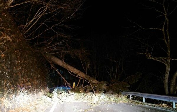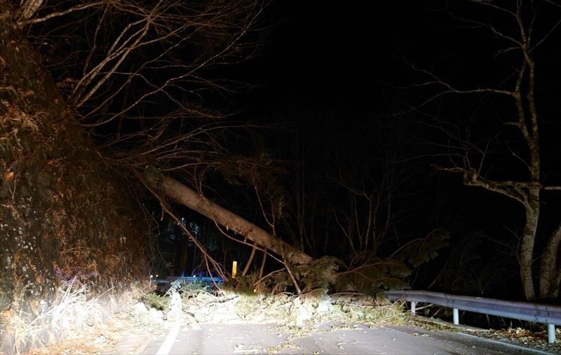倒木があった第一いろは坂=15日午後6時35分、日光市中宮祠