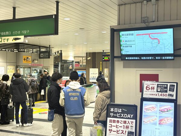 「東北新幹線運転見合わせ」の案内表示(右上)=JR宇都宮駅構内