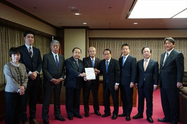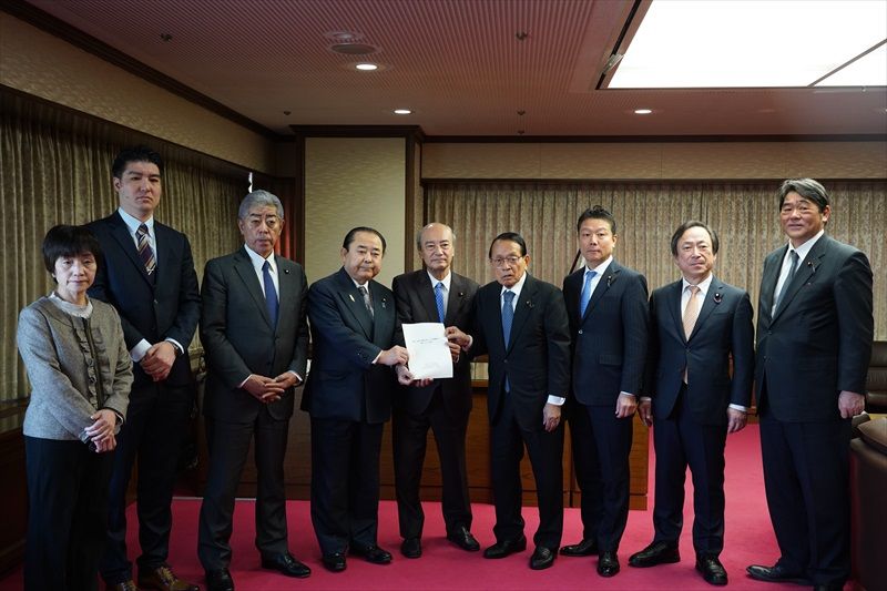 小泉法相(左から5人目)に提言書を提出した自民党議員ら=20日午前、法務省
