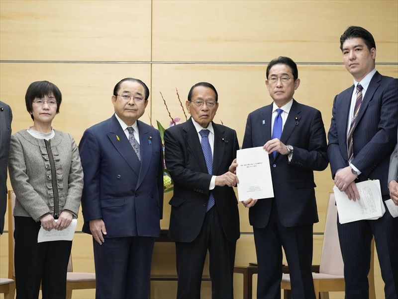 自民党のプロジェクトチームから危険運転致死傷罪に関して提言を受け取る岸田首相(右から2人目)=20日午後、首相官邸