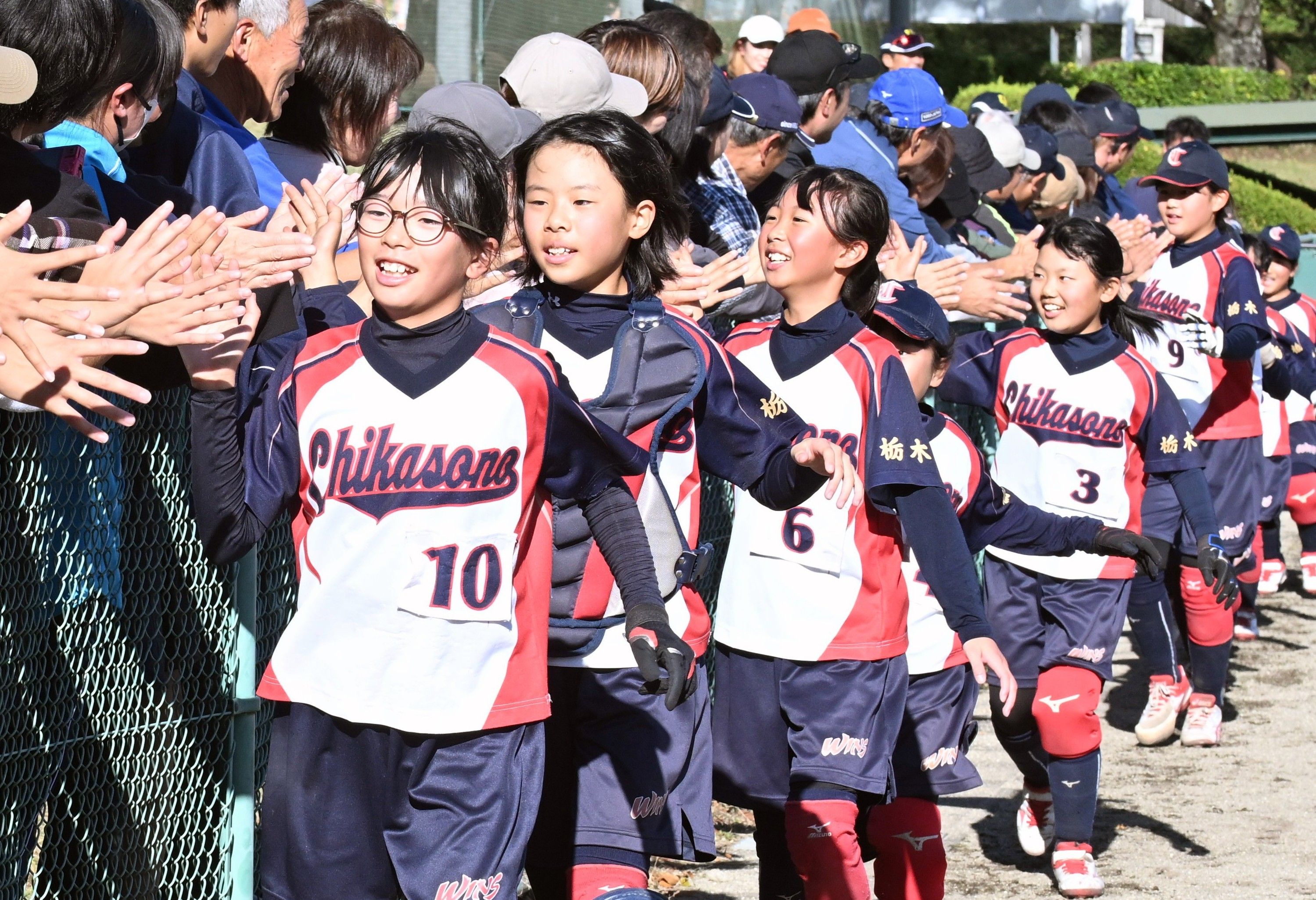 3年ぶり2度目の優勝を果たし、応援団とハイタッチする親園WINSの選手たち