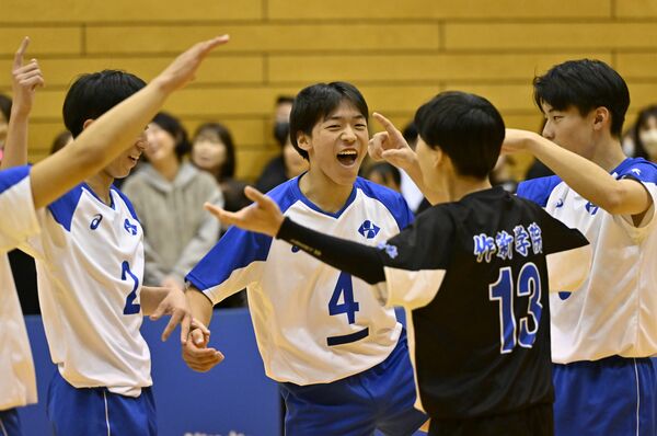 男子準決勝 作新の小林(中央)がサービスエースを決め、仲間たちと喜ぶ=DAIKYOアリーナ佐野、湯田大士撮影
