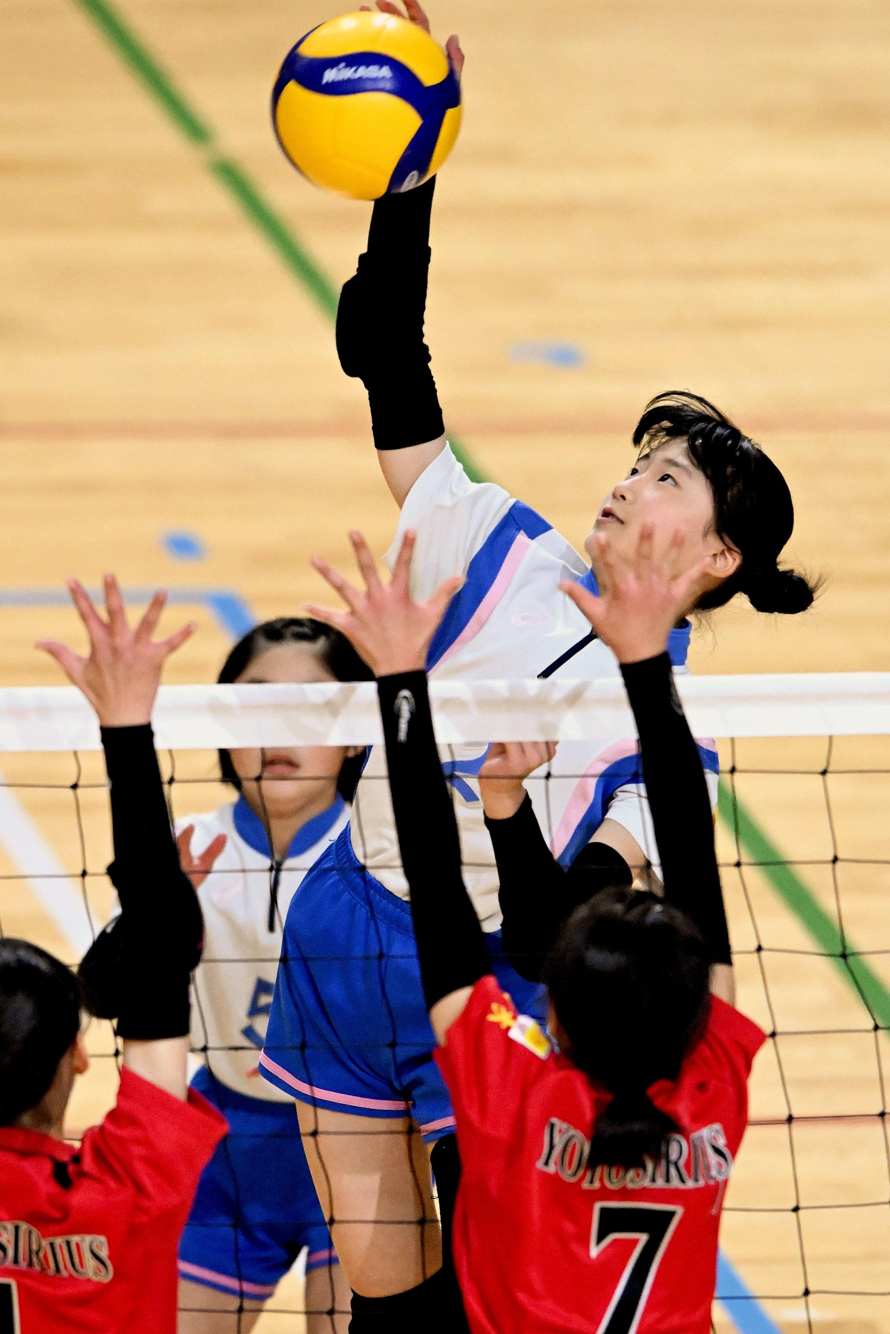 女子準決勝 文星女の阿部がブロックアウトで得点を奪う=DAIKYOアリーナ佐野