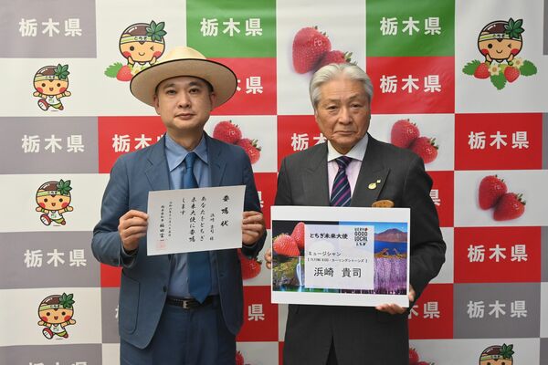 福田知事(右)から委嘱状を受け取った浜崎さん=25日午後、県庁