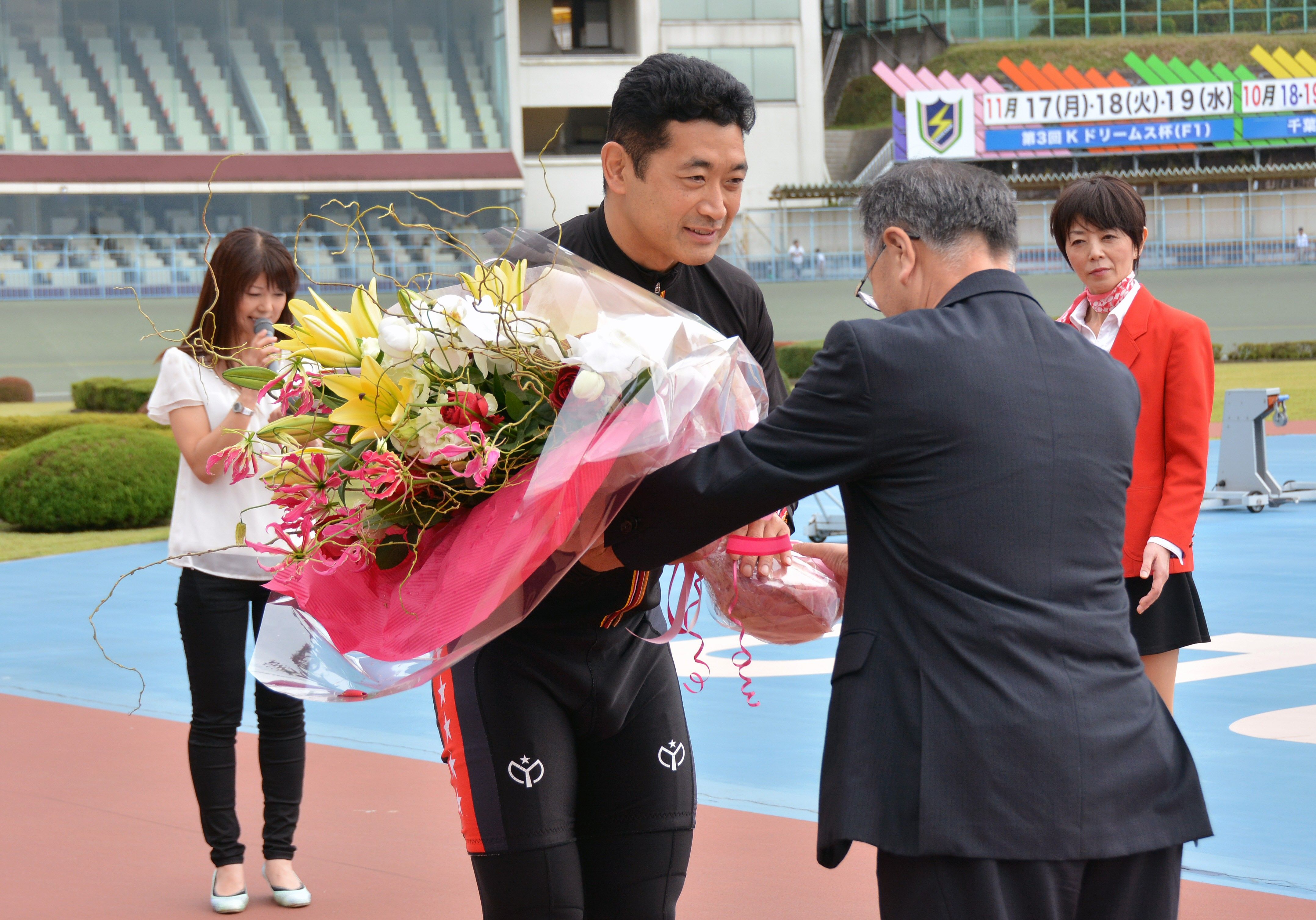 通算800勝を祝うセレモニーで花束を受け取る神山(中央)。30年以上にわたって競輪界の第一人者であり続けた=2014年10月15日、宇都宮競輪場