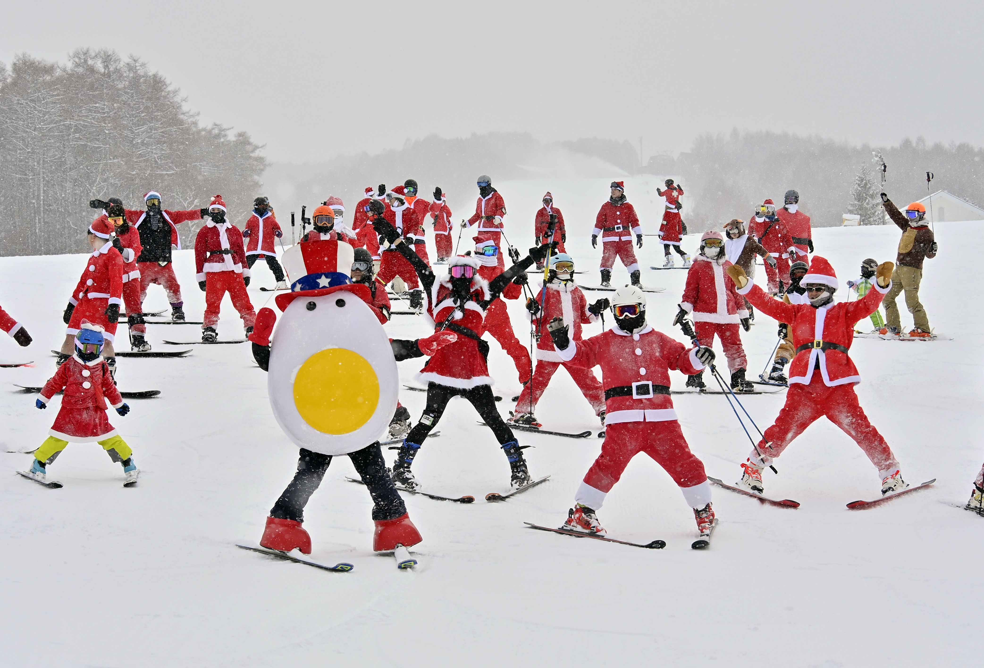 サンタクロース姿などで一斉に滑走する来場客ら=24日午前10時25分、那須塩原市湯本塩原