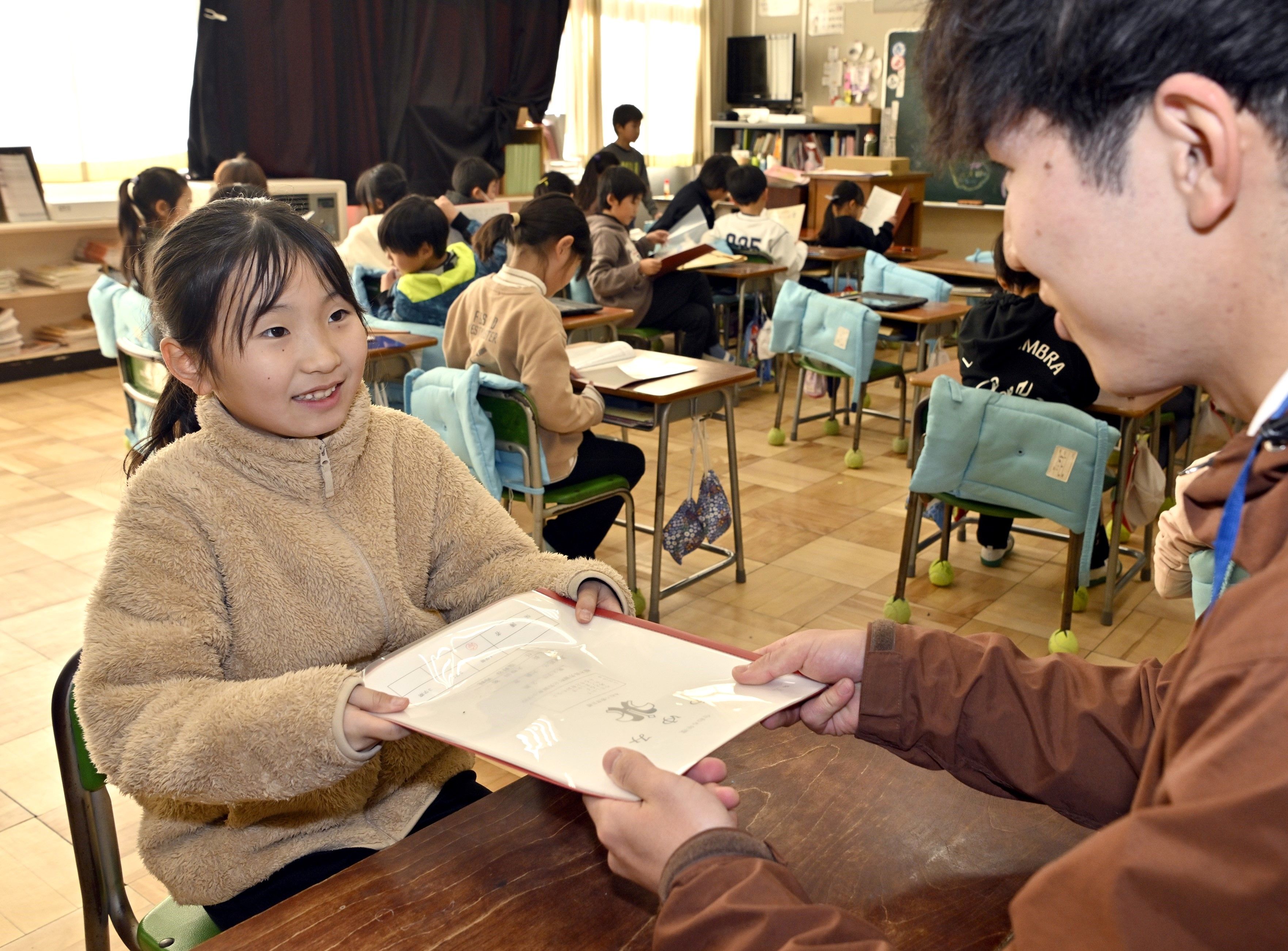 冬休みを前に担任教諭から通知表を受け取る児童=25日午前11時45分、芳賀町祖母井
