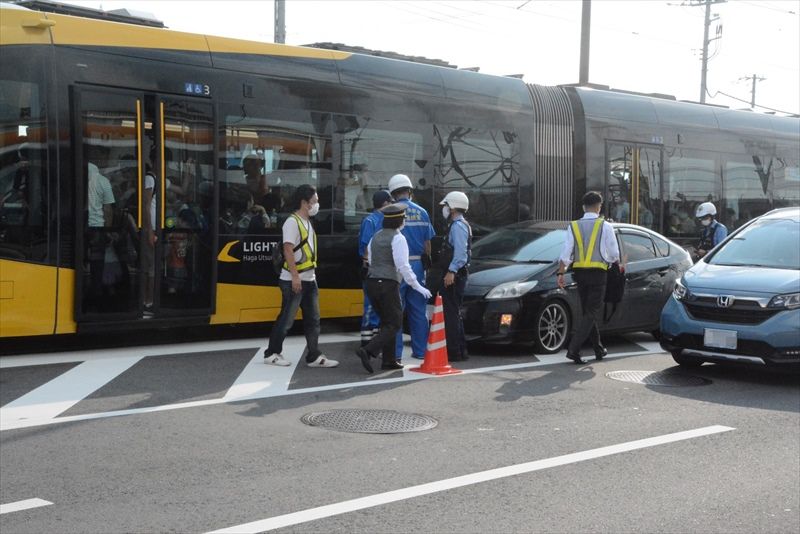 乗用車の車体の一部が導流帯から軌道内に進入し、LRT車両と接触した事故現場=9月17日、宇都宮市陽東5丁目(画像は一部加工しています)