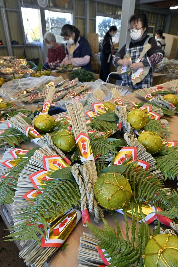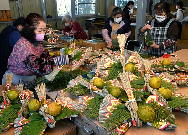一つ一つ手作業で仕上げられるしめ飾り=10日午前10時40分、宇都宮市金田町