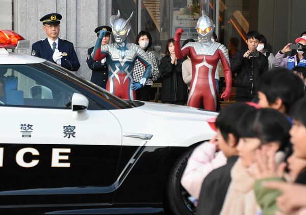 ウルトラ出発式に駆け付けたウルトラセブン(右)とウルトラマンゼロの親子=10日午後、県庁