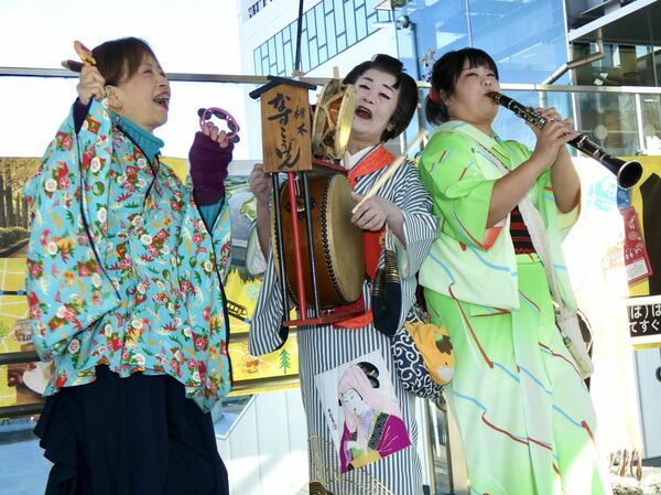 昔懐かし、JR宇都宮駅にちんどん屋が登場 昭和歌謡曲やクリスマスソング奏でる