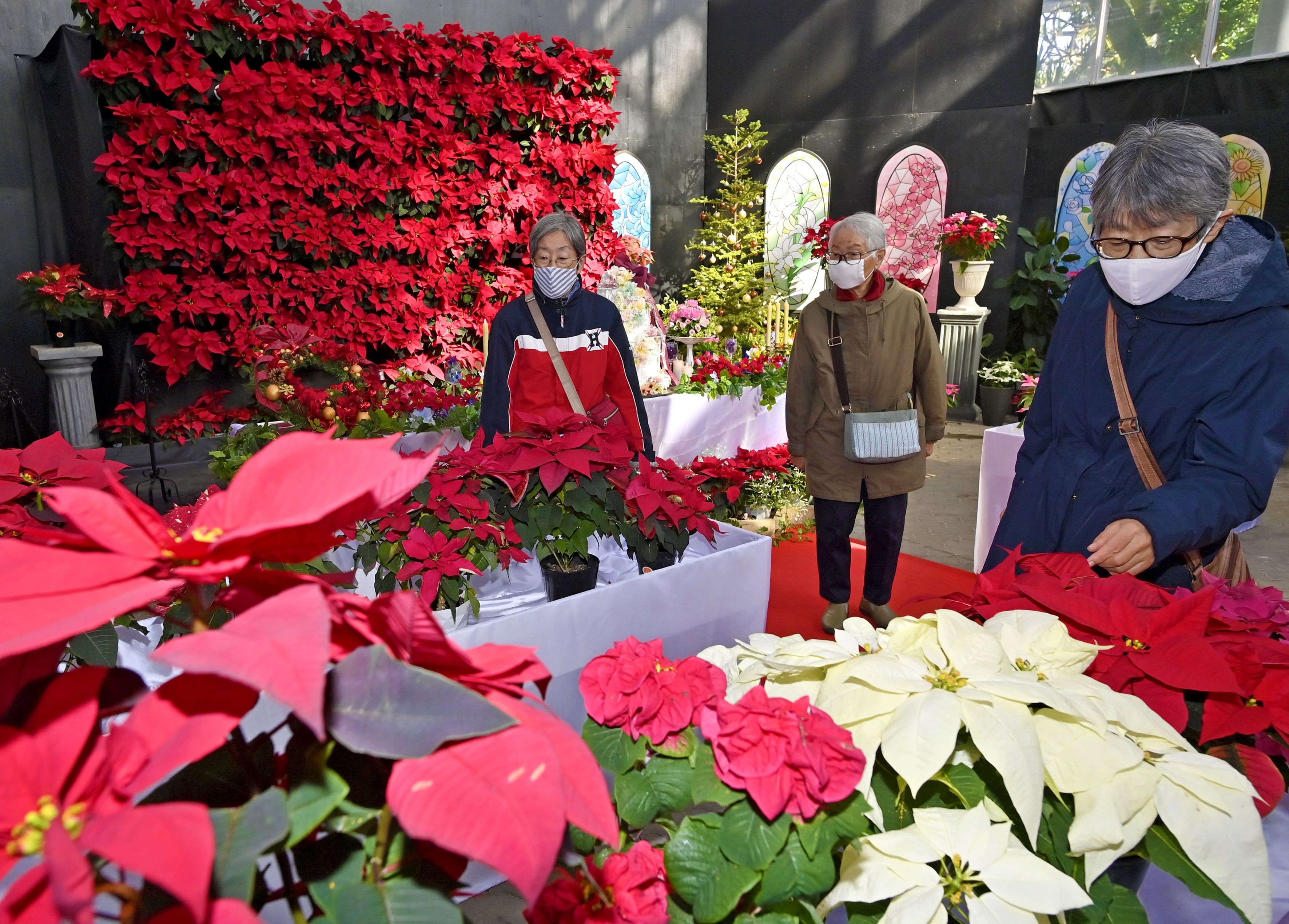 約30品種のポインセチアが並ぶ企画展=11日午前11時10分、栃木市岩舟町下津原