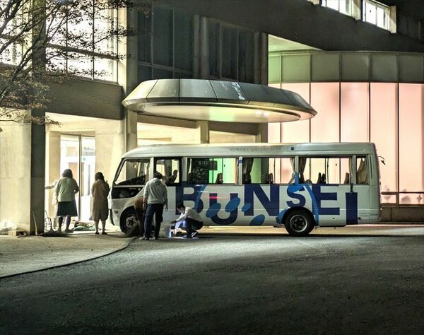 文星芸大の管理棟に衝突した同大のスクールバス=24日午後5時45分、宇都宮市上戸祭4丁目