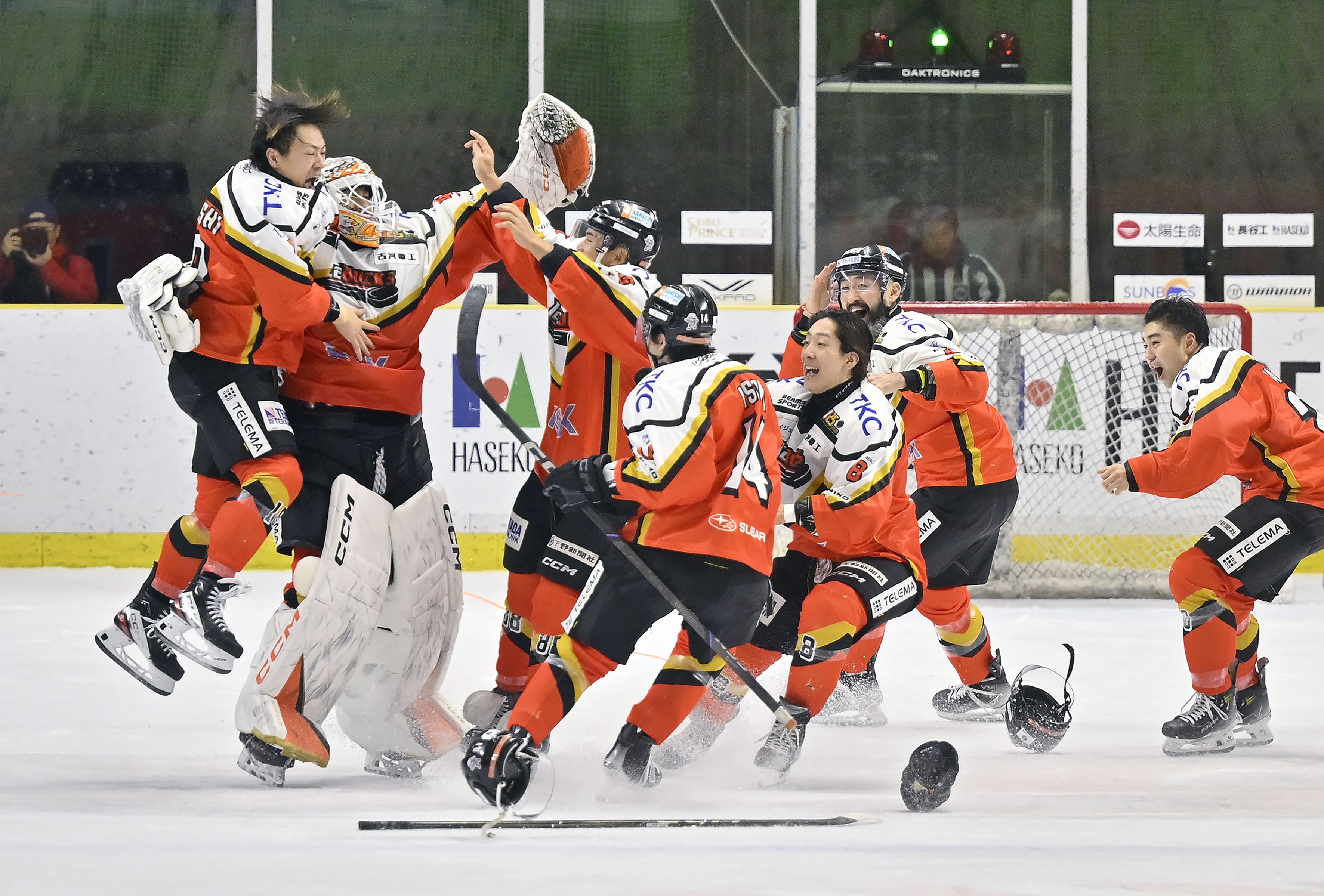 延長20秒、バックスのFW鈴木(手前右から2人目)が決勝ゴールを決める=日光霧降アイスアリーナ、広瀬華撮影