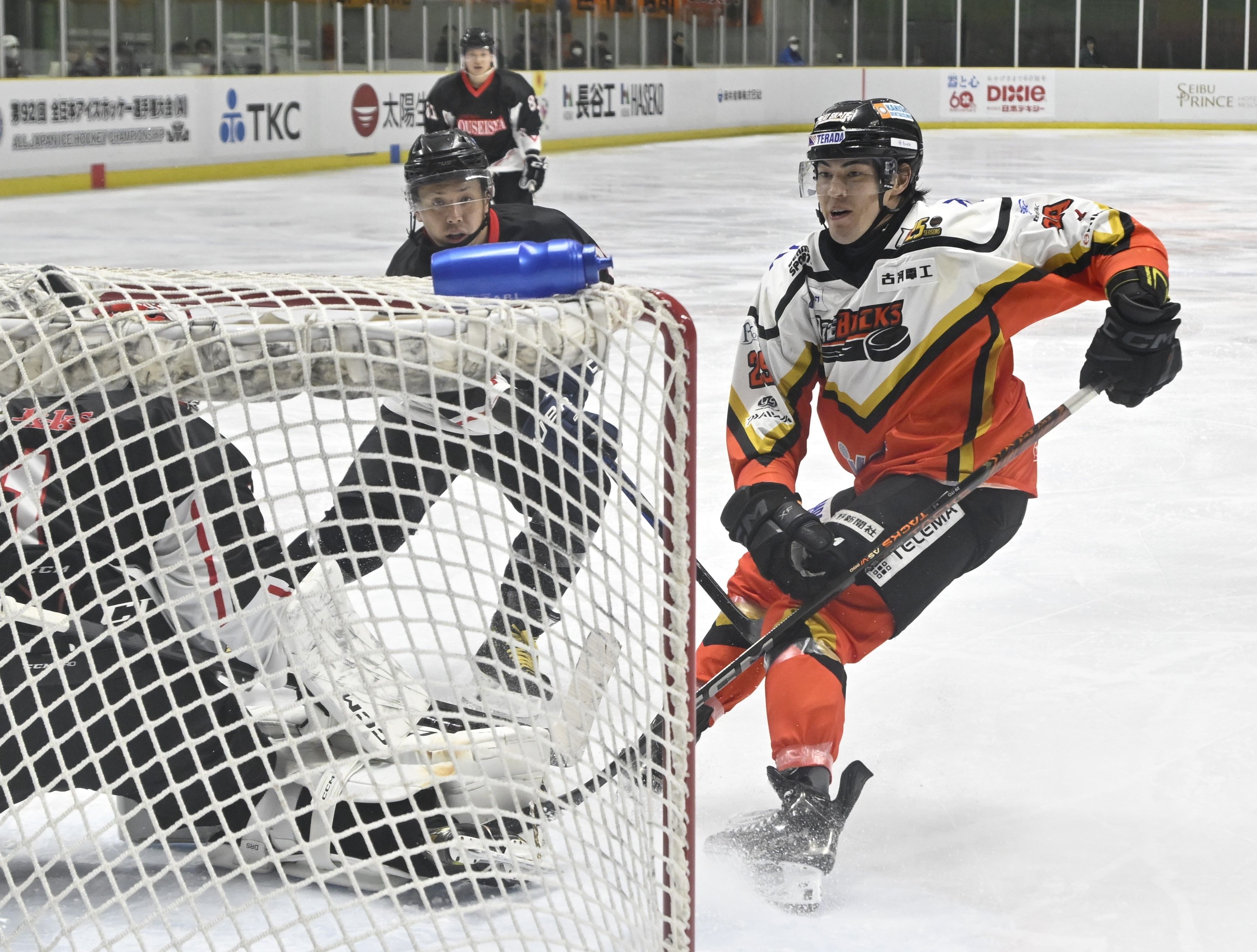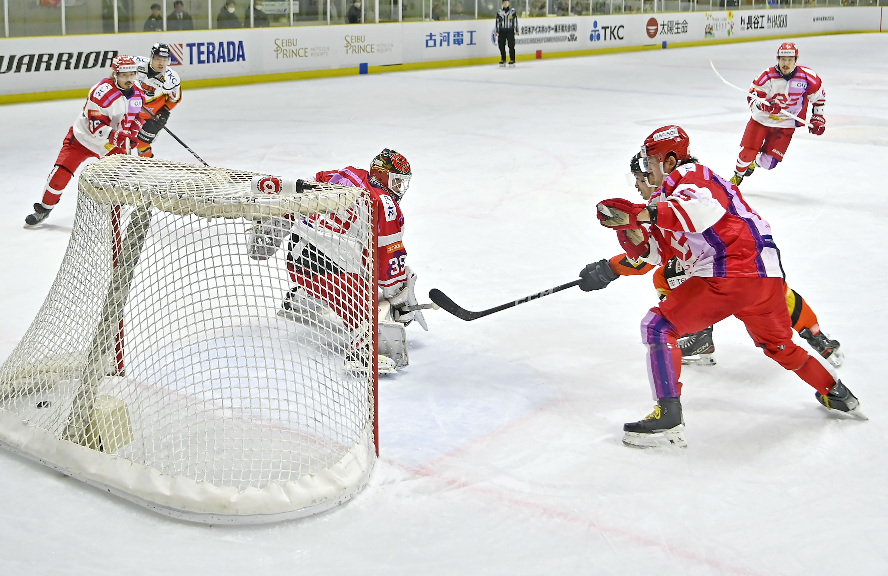第3ピリオド、バックスのFW伊藤がゴールを決める=日光霧降アイスアリーナ、鈴木久崇撮影