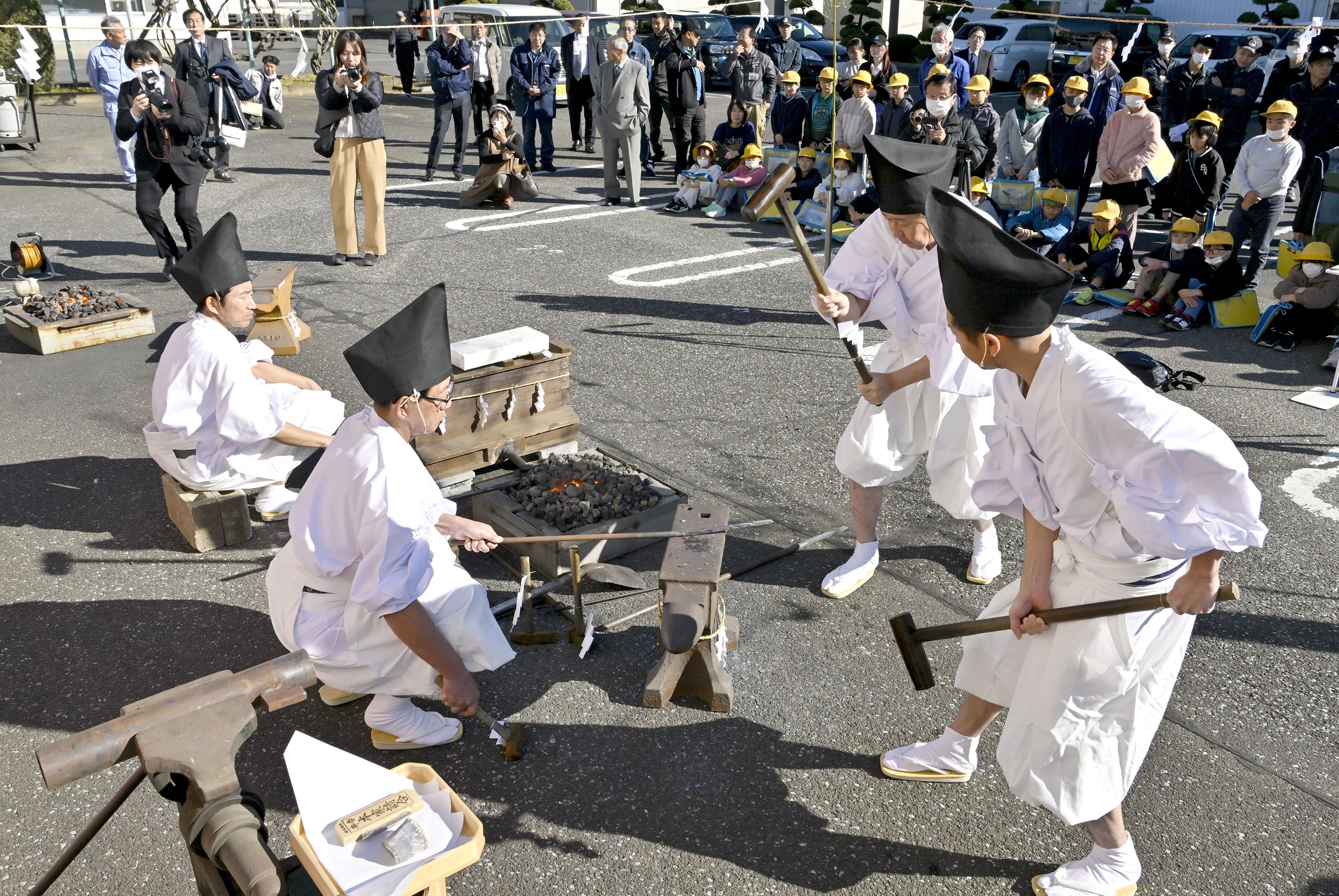 大づちを振るって鉄を鍛える鉄工業関係者ら=6日午前10時35分、足利市福富新町