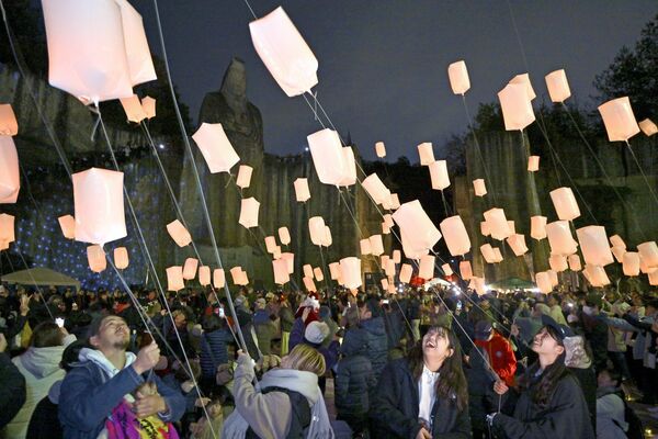 大谷公園を幻想的に彩るランタン=7日午後5時5分、宇都宮市大谷町