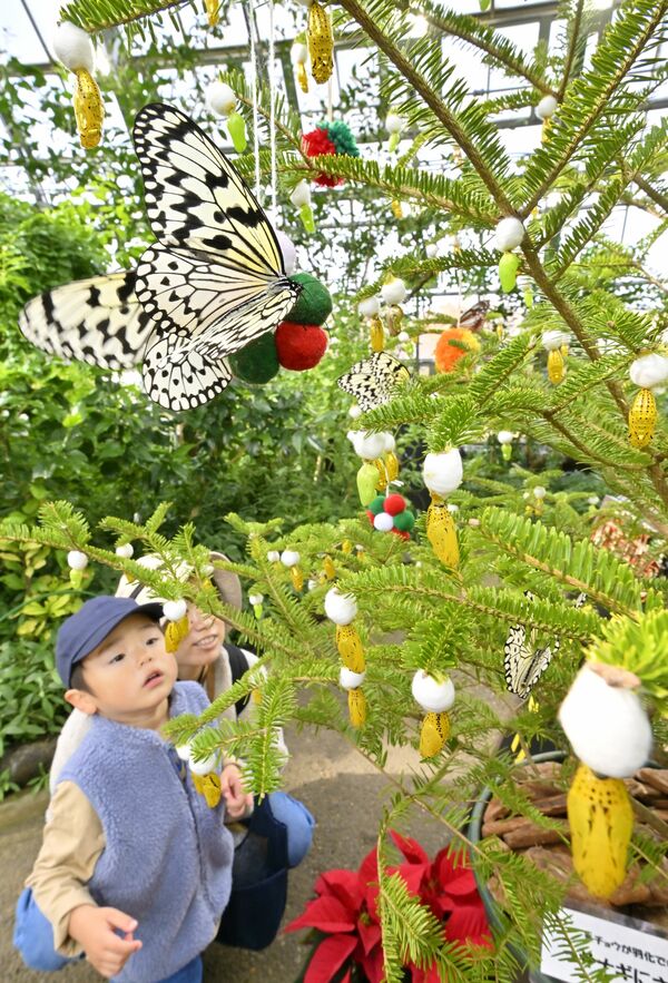 オオゴマダラや金色などのサナギで彩られたツリー=4日午前11時15分、真岡市下籠谷