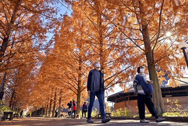 オレンジ色に色づいたメタセコイア並木=30日午前10時25分、野木町野木