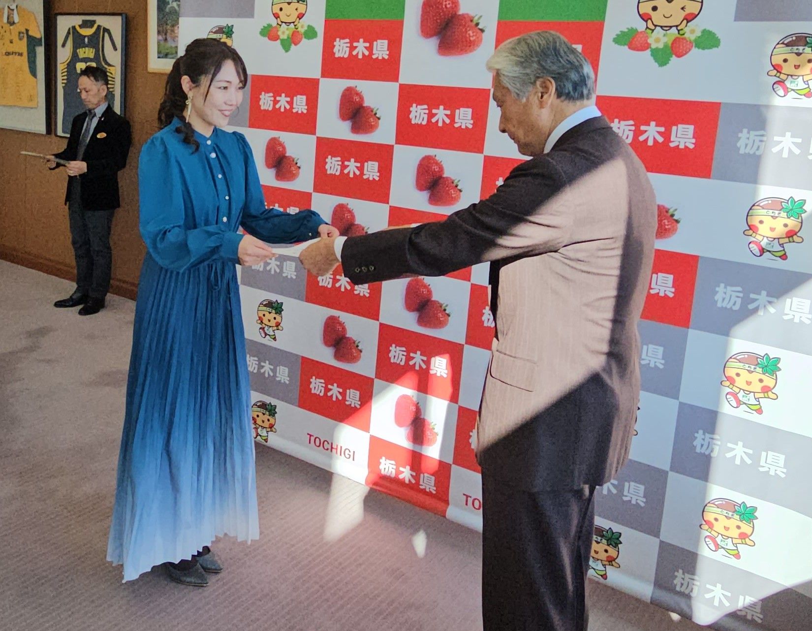 福田知事(右)から委嘱状を受け取る山口さん=2日午前、県庁