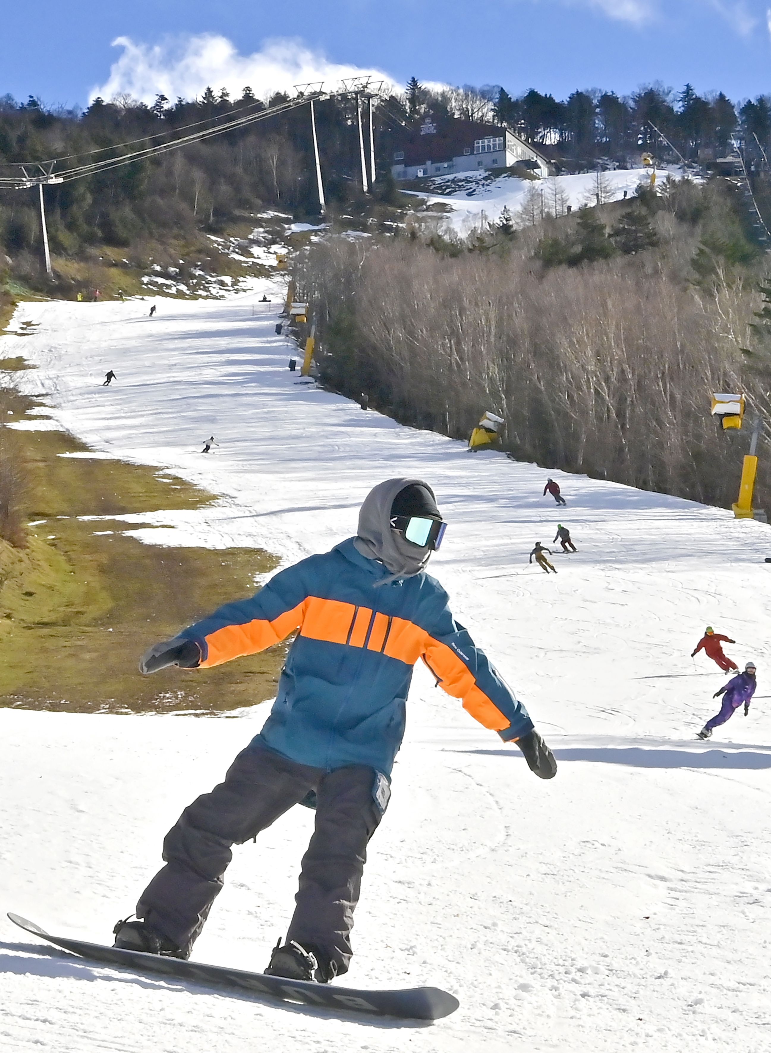 オープンしたゲレンデを滑走するスノーボーダーら=29日午前10時10分、那須塩原市湯本塩原