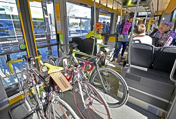 車内スタンドに自転車を固定して移動する実証実験の参加者たち=1日午前10時55分、宇都宮市清原工業団地、広瀬華撮影