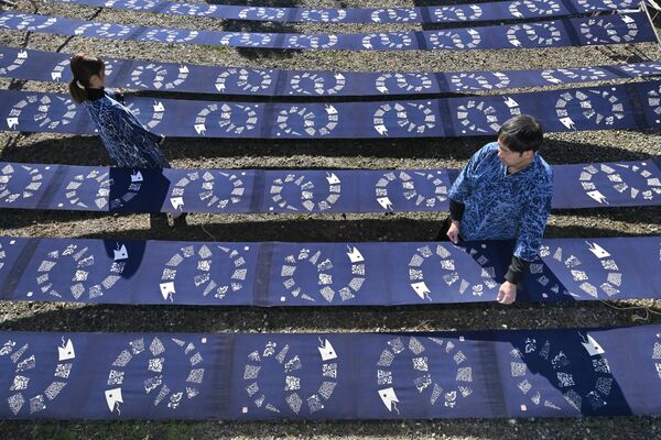 天日に干される「巳」を描いた藍染め生地=2日午前10時20分、大田原市黒羽向町