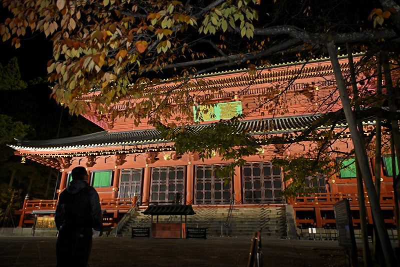 試験点灯でライトアップされる三仏堂=28日午後5時45分、日光市山内、森田大地撮影