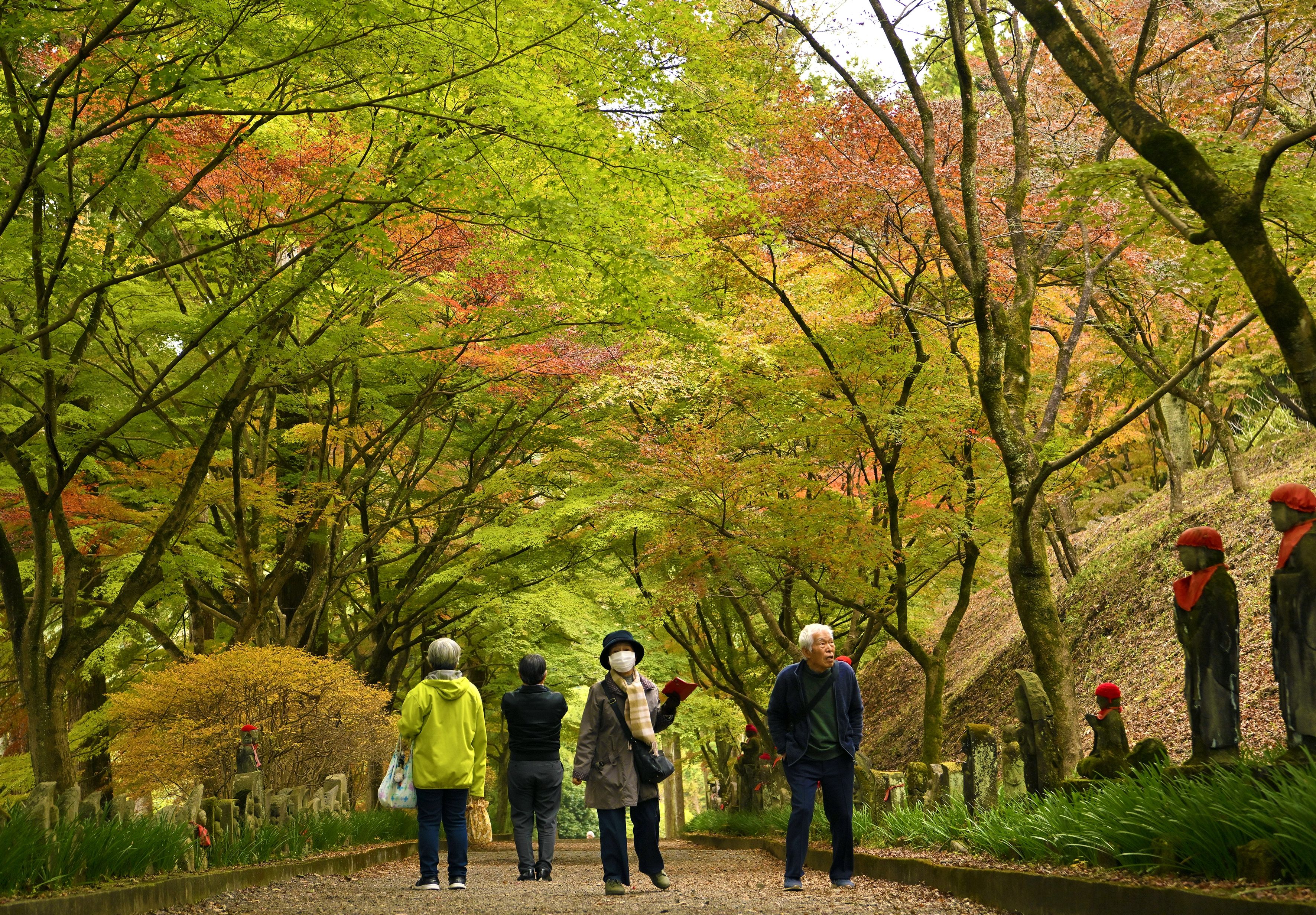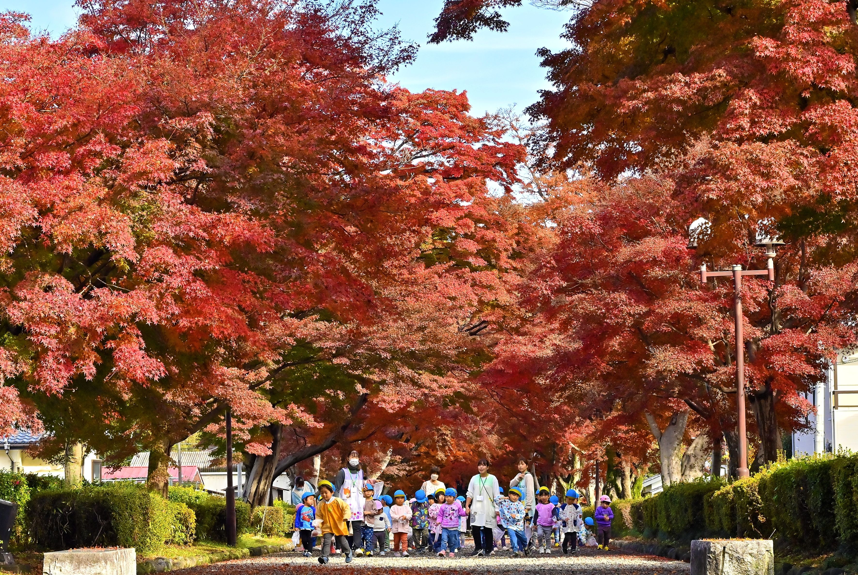 イロハモミジが真っ赤に色づいた大山参道=27日午前10時30分、那須塩原市下永田3丁目