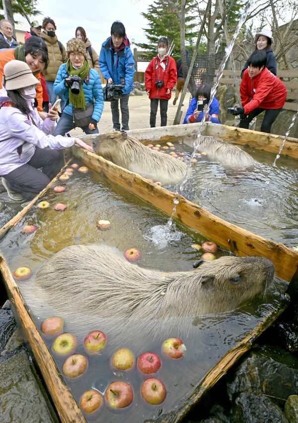 来園者の前でリンゴ湯に漬かるカピバラ=26日午後1時10分、那須町大島