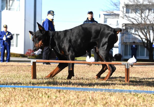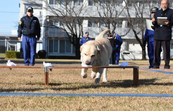 審査会で遺留品の臭いを嗅ぎ分ける犬=25日午前、県警察学校