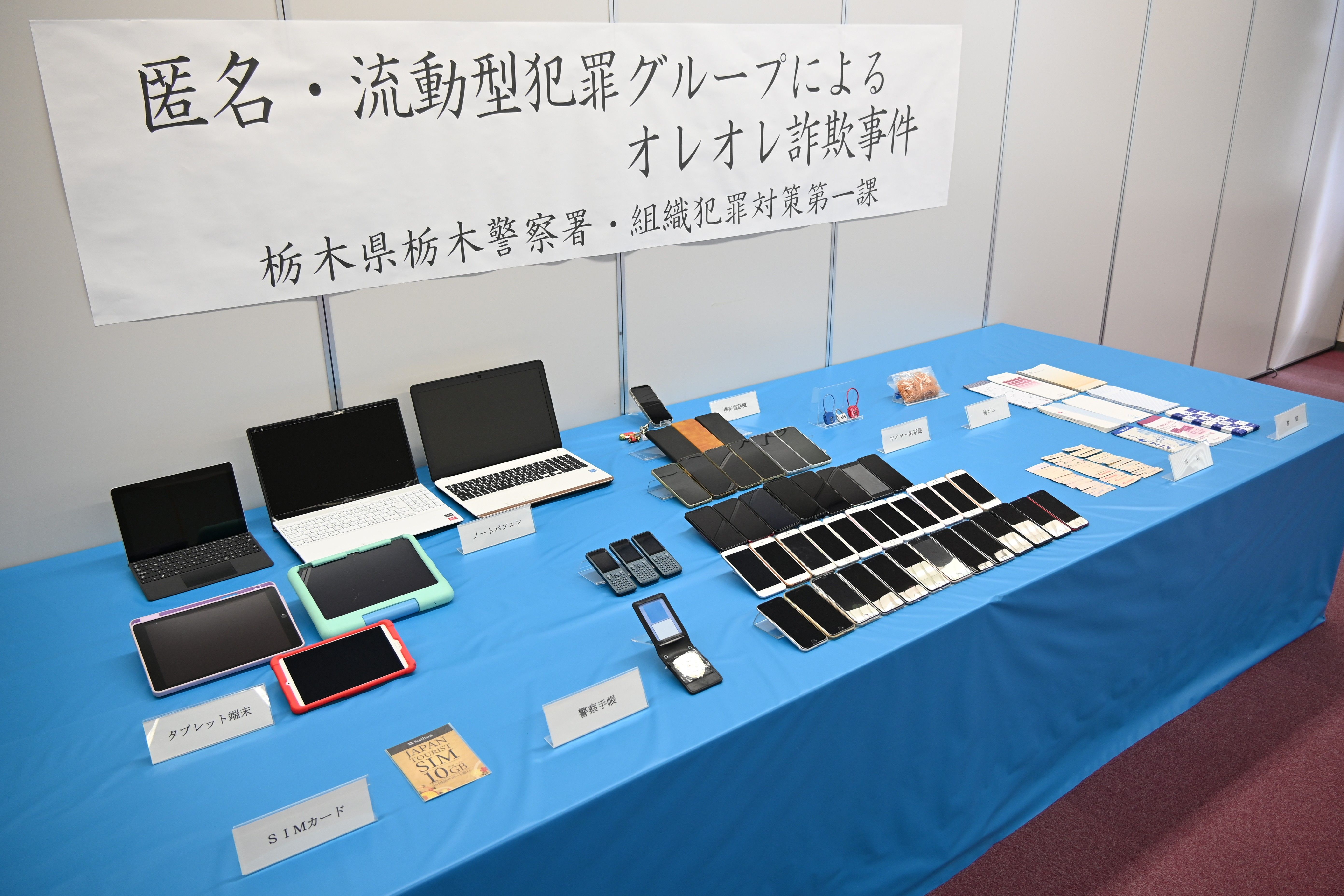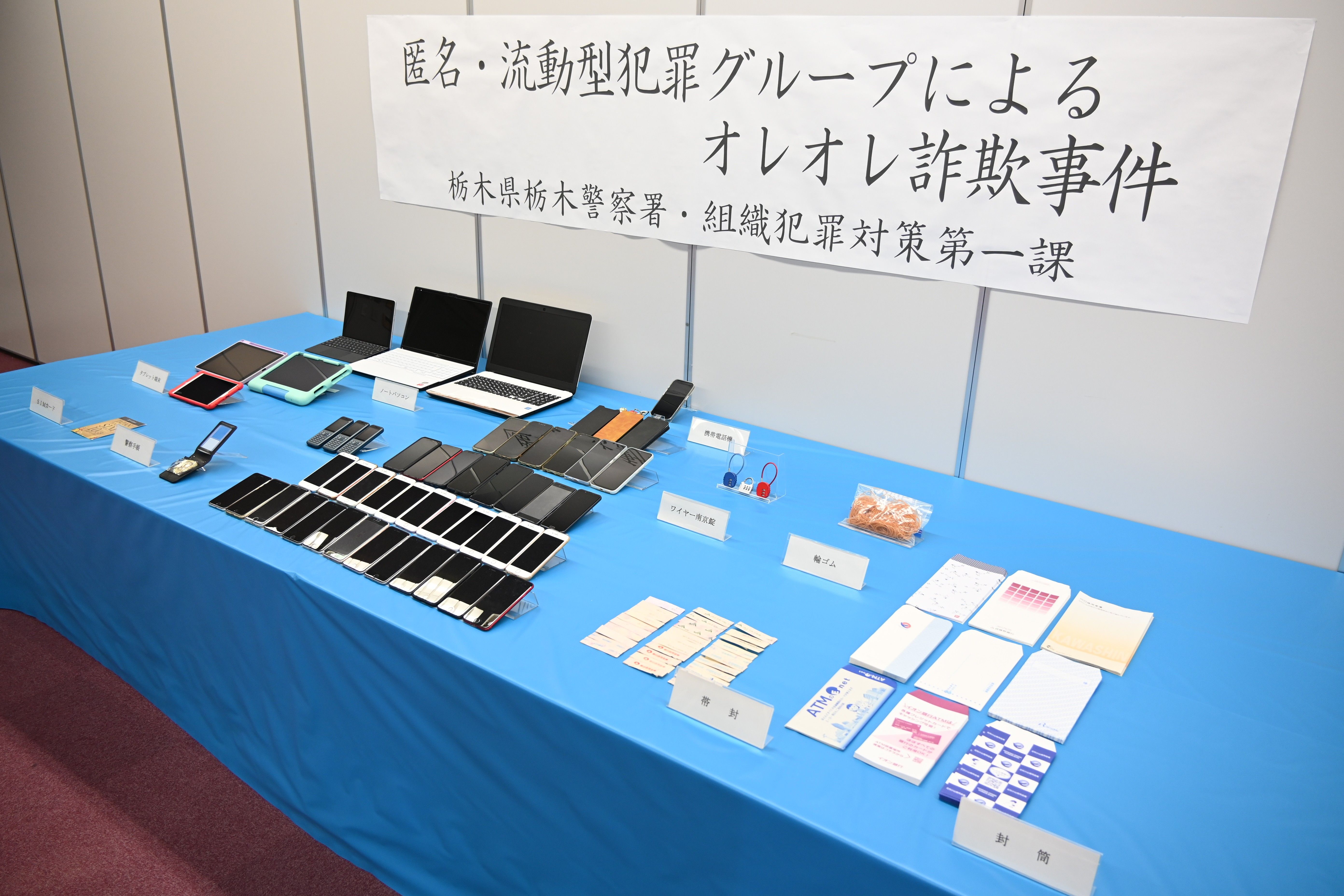 両容疑者宅から押収されたスマートフォンや偽の警察手帳など=10日午後、栃木署
