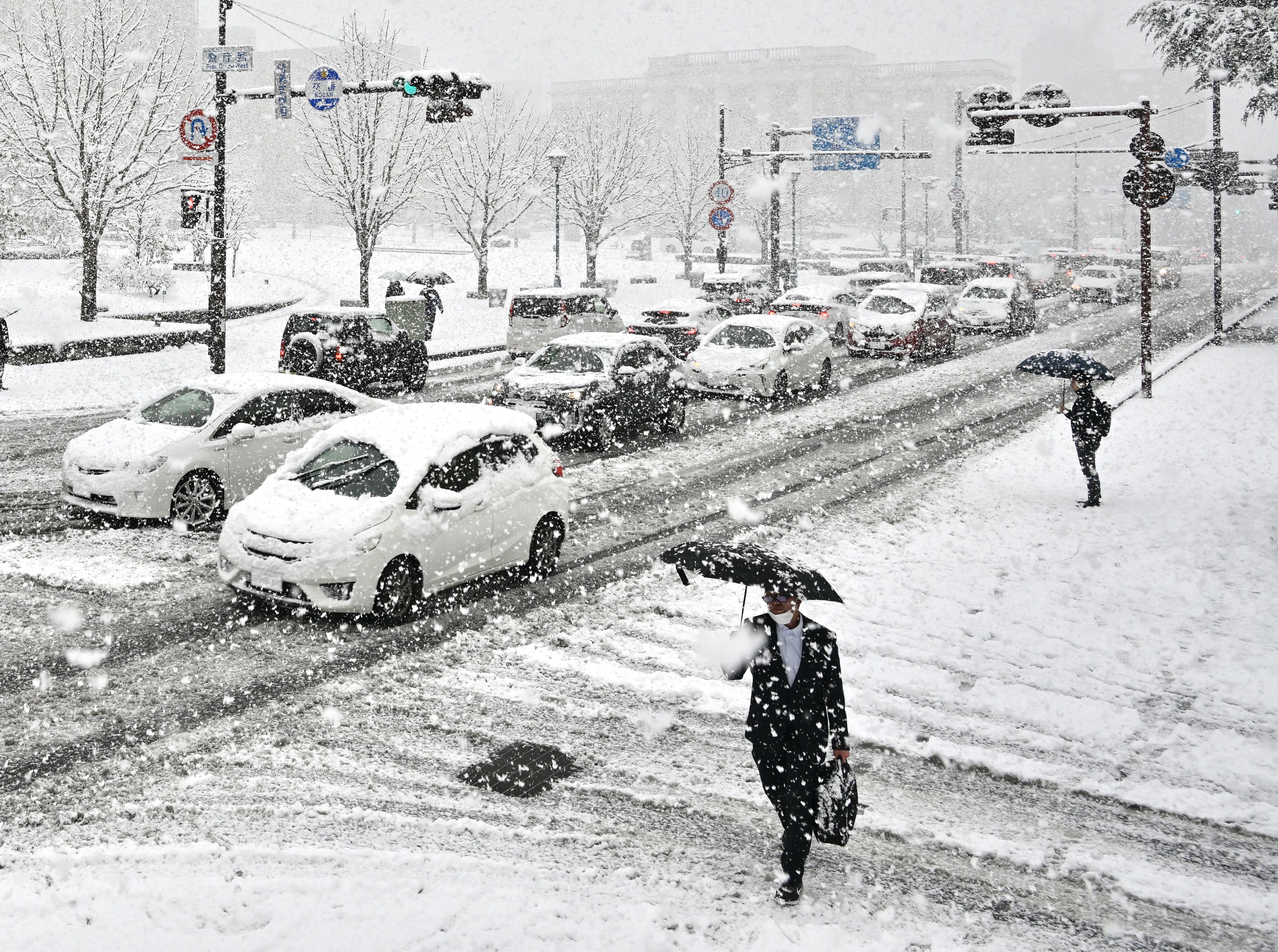 大粒の雪が降り積もった栃木県庁前=10日午前8時25分、宇都宮市本町