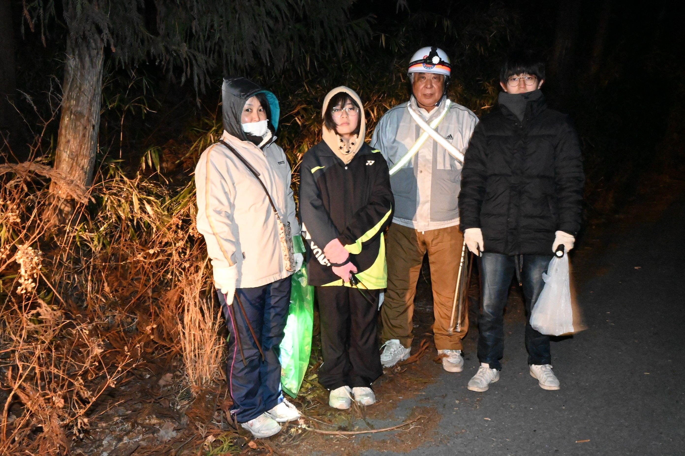 早朝のごみ拾いに取り組む(左から)紀子さん、彩乃さん、守さん、悠真さん