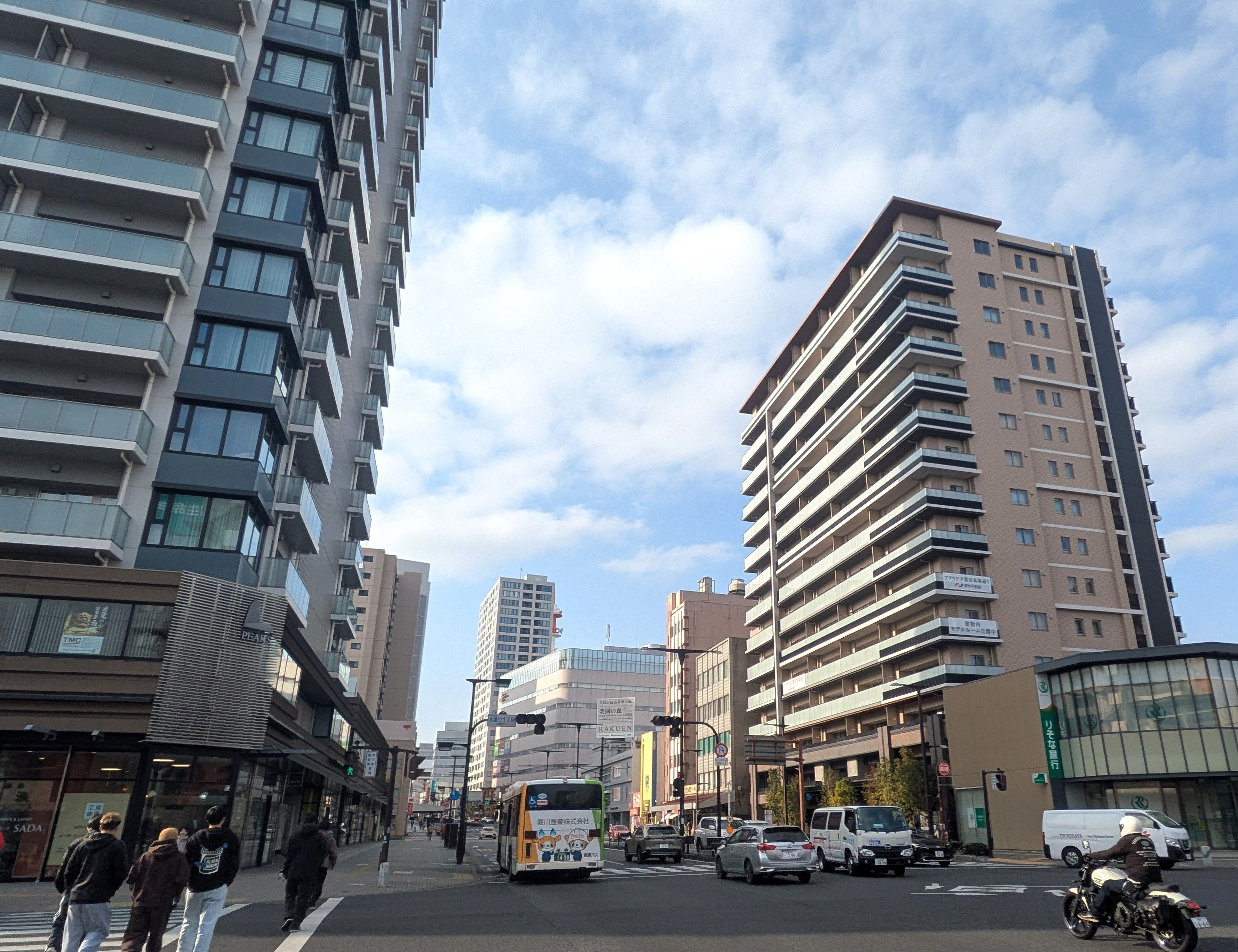 マンション建設が相次いだ市中心部。道路右側は「プラウド宇都宮馬場通り」。左側手前は「宇都宮PEAKS」、130メートルほど奥に「サンクレイドル宇都宮V」がある=1月19日午後、宇都宮市大通り1丁目交差点