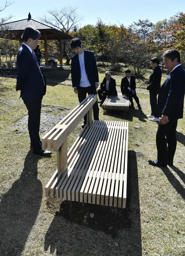 寄付された木製ベンチを確かめる渡辺市長(中央)ら
